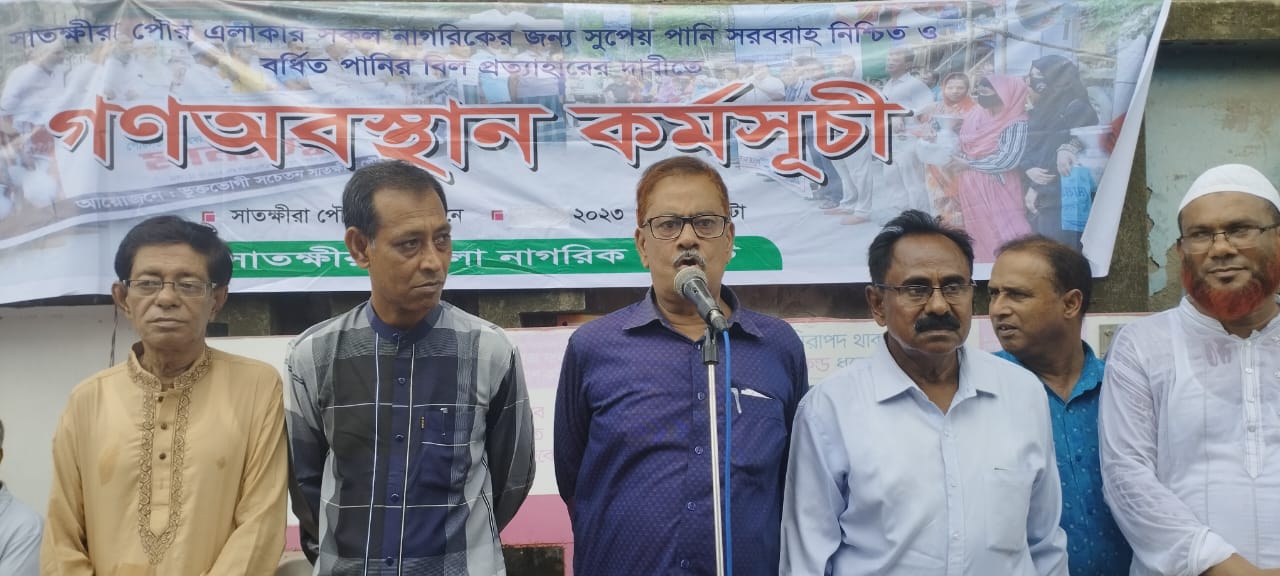 বেসরকারী উন্নয়ন সংস্থা লিডার্স এর সহযোগিতায় সাতক্ষীরা পৌরসভার বর্ধিত পানির বিল প্রত্যাহার এবং রাস্তাঘাট-ড্রেনেজসহ বিভিন্ন সমস্যা সমাধানের দাবীতে বুধবার (১২ জুলাই ২০২৩) সকাল ১০টায় পৌরসভার সামনে গণঅবস্থান কর্মসূচি পালন করেছে সাতক্ষীরা জেলা নাগরিক কমিটি এবং জেলা জলবাযু অধিপরামর্শ ফোরাম । গণঅবস্থান থেকে আগামী ২৯ জুলাই পর্যন্ত শহরের বিভিন্ন এলাকায় গণসংযোগ এবং ৩০ জুলাই পরবর্তী কর্মসূচি ঘোষণা করা হয়। জেলা নাগরিক কমিটির আয়োজনে অনুষ্ঠিত গণঅবস্থান কর্মসূচিতে সভাপতিত্ব করেন এবং কর্মসূচি ঘোষণা করেন সংগঠনের আহবায়ক এড. শেখ আজাদ হোসেন বেলাল।  ণঅবস্থান কর্মসূচিতে বক্তব্য রাখেন বীর মুক্তিযোদ্ধা অধ্যক্ষ আবু আহমেদ, বীর মুক্তিযোদ্ধা সুভাষ সরকার, এ্যাড. আবুল কালাম আজাদ, সুধাংশু শেখর সরকার, শেখ ওবায়দুস সুলতান বাবলু,  সাবেক পিপি এ্যাড. ওসমান গনি, শেখ সিদ্দিকুর রহমান, ইদ্রিস আলী, কাজী আকতার হোসেন, আবুল হোসেন, হাসান ইমাম, নিত্যানন্দ সরকার, মুনসুর রহমান, আবু তালেব, আব্দুস সামাদ, আদিত্য মল্লিক, আব্দুস সাত্তার, মো.আব্দুল্লাহ, কামরুজ্জামান কামু, গৌরপদ দাস, লিডার্স  কর্মী সুলতা সাহা, বায়জিত হোসেন প্রমুখ। কর্মসূচি পরিচালনা করেন আলী নুর খান বাবলু।বক্তারা বলেন, কোন পূর্ব ঘোষণা ছাড়াই সাতক্ষীরা পৌরসভার সরবরাহকৃত পানির বিল চারগুন বৃদ্ধি করা হয়েছে। বিষয়টি নিয়ে পৌরসভার মেয়র, ভারপ্রাপ্ত মেয়রসহ পৌর পরিষদের সাথে একাধিকবার আলাপ-আলোচনাকালে অযৌক্তিকভাবে বৃদ্ধিকৃত বিল প্রত্যাহারের দাবী জানানো হয়। পৌর মেয়র নিজেও অযৌক্তিকভাবে বৃদ্ধিকৃত বিল প্রত্যাহারের আশ্বাস দেন। কিন্তু অদ্যবধি বিল প্রত্যাহার করা হয়নি। বক্তারা আরো বলেন, বাংলাদেশের মধ্যে সাতক্ষীরাই একমাত্র পৌরসভা- যেখানে আগে নিউমার্কেট ছিল এখন নেই। আগে পাবলিক অডিটরিয়াম ছিল এখন নেই। আগে পৌর মিলনায়তন ছিল এখন নেই। আগে শিশু পার্ক ছিল এখন নেই। আগে রাস্তায় ঝাড়–দার ছিল এখন নেই। আগে রাস্তার পাশে ফুটপাথ না থাকলেও সাধারণের চলাচলের পরিবেশ ছিল এখন নেই। আগে সুলতানপুর বড়বাজারে তরিতরকারী ব্যবসায়ীদের বসার জায়গা ছিল এখন নেই। তারা এখন রাস্তায় বসে। ইটাগাছা সান্ধ্য হাটের অস্তিত্ব বিলুপ্ত প্রায়। শহিদ আব্দুর রাজ্জাক পার্ক দখল করে সেখানে কমপক্ষে ১০টি অবকাঠামো গড়ে তোলা হয়েছে। সেখানে অবসর বিনোদনের কোন পরিবেশ নেই। বিভিন্ন এলাকায় আগে পাবলিক টয়লেট থাকলেও এখন তার অধিকাংশই নেই। আগে ডাসবিন ছিল এখন নেই। রাস্তার পাশে পাকা পানির ট্যাপ ছিল এখন নেই। আগে রাস্তাঘাট ছিল এখন তার ছাল-চামড়া নেই। যানজট নিরসনে রাস্তায় ট্রাফিক দাড়ানোর জায়গা নেই। নতুন নতুন এলাকায় আবাসন