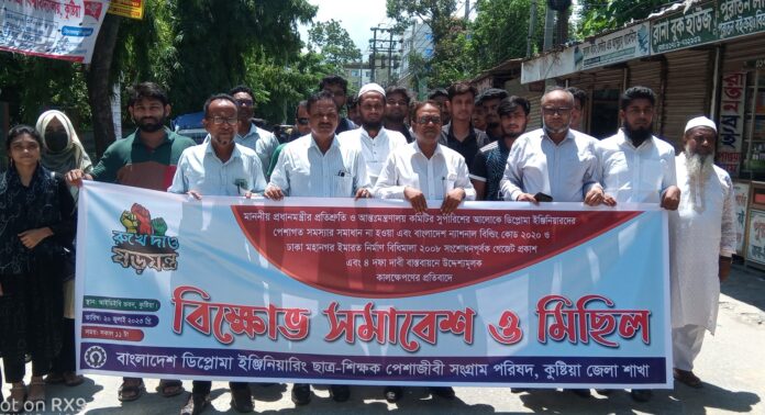 বৃহস্পতিবার (২০ জুলাই) সকাল ১১ টায় কুষ্টিয়া পলিটেকনিক্যাল কলেজ চত্বরে বাংলাদেশ ডিপ্লোমা ইঞ্জিনিয়ার্স কুষ্টিয়া শাখা এই বিক্ষোভ সমাবেশ ও মিছিলের আয়োজন করে। বিক্ষোভ সমাবেশ ও মিছিলে লিখিত বক্তব্যে বাংলাদেশ ডিপ্লোমা ইঞ্জিনিয়ারিং পেশাজীবী ছাত্র শিক্ষকেরদের ৪ দফা দাবি তুলে ধরেন তারা। এ সময় বক্তারা বলেন, মাননীয় প্রধানমন্ত্রীর প্রতিশ্রুতি ও আন্তঃমন্ত্রণালয় কমিটির সুপারিশের আলোকে বাংলাদেশ ডিপ্লোমা ইঞ্জিনিয়ারদের পেশাগত সমস্যার সমাধান না হওয়া এবং বাংলাদেশ ন্যাশনাল বিল্ডিং কোড ২০২০ ও ঢাকা মহানগর ইমারত নির্মাণ বিধিমালা ২০০সংশোধনপূর্বক গেজেট প্রকাশে উদ্দেশ্যমূলক কালক্ষেপণের প্রতিবাদে আন্দোলনের করেন বাংলাদেশ ডিপ্লোমা ইঞ্জিনিয়ারিং ছাত্র শিক্ষক পেশাজীবী কুষ্টিয়া জেলা শাখার সংগ্রাম পরিষদ।