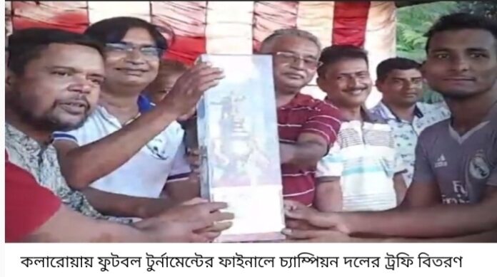 এম,এ সাজেদ, কলারোয়া( সাতক্ষীরা) প্রতিনিধি:কলারোয়া সরকারি পাইলট হাইস্কুল ফুটবল মাঠে ৪ দলীয় ফুটবল টূর্ণামেন্টের ফাইনাল খেলায় “বল্ডফিল্ড বয়েজ একাদশ চ্যাম্পিয়ান হয়েছে। “খেলা ধুলায় বাড়ে বল, মাদক ছেড়ে খেলতে চল”- এই শ্লোগান কে সামনে রেখে ফাইনালে মুখোমুখি হয় ‘বল্ডফিল্ড বয়েজ একাদশ বনাম সাইফুল ফুটবল একাদশ। শনিবার(২২ জুলাই) বিকালে ‘আবদুল বারিক সরদার, মাষ্টার হাবিবুল্লাহ ও সুমন কুমার দাস সহ বন্ধু মহল আয়োজিত ৪ দলীয় ফুটবল টূর্ণামেন্টের ফাইনাল খেলার শুরুতেই আক্রমন- পাল্টা আক্রমনে কোন দলই গোল করতে পারেনি। নির্ধারিত সময়ে কোন দল গোল করতে না পারায় খেলা ট্রাইবেকারে গড়ায়। ট্রাইবেকারে বল্ডফিল্ড একাদশ ৩-২ গোলে সাইফুল একাদশ কে পরাজিত করে চ্যাম্পিয়ান হওয়ার যোগ্যতা অর্জন করে। খেলায় ম্যান অব দ্যা ম্যাচ ও ম্যান অব দ্যা টূর্ণামেন্ট নির্বাচিত হন বল্ডফিল্ড বয়েজ একাদশের গোলকিপার তপু। টূর্ণামেন্টের সেরা গোলকিপার নির্বাচিত হন সাইফুল একাদশের গোলকিপার হাফিজুল। খেলা টি পরিচালনা করেন মাসউদ পারভেজ মিলন, রুহুল আমিন ও কামরুজ্জামান বাবু । খেলার ধারাভাষ্যে ছিলেন সহকারী অধ্যাপক রফিকুল ইসলাম ও শিক্ষক শেখ শাহাজাহান আলী শাহিন। খেলার আগে উভয় দলের খেলোয়াড়দের সাথে শুভেচ্ছা বিনিময় করে খেলাটি উপভোগ করেন উপজেলা ক্রীড়া সংস্থার সাধারণ সম্পাদক জাহিদুর রহমান খান চৌধুরী, পাবলিক ইনস্টিটিউটের সাধারণ সম্পাদক এ্যাডঃ শেখ কামাল রেজা, সহকারী মাধ্যমিক শিক্ষা অফিসার হারুন অর রশিদ, প্রধান শিক্ষক বদরুজ্জামান বিপ্লব, শিক্ষক ও সাংবাদিক দীপক শেঠ, ক্রীড়া সংগঠক রেজাউল করিম লাভলু, রমজান আহমেদ, ফুটবল কোচ মাসউদুর রহমান মাসুূদ, কাজী শাহাজান, আয়োজক কর্মকর্তা আবদুল বারিক সরদার ও মাষ্টার হাবিবুল্লাহ, সুমন দাস সহ সহস্রাধিক ক্রীড়াপ্রেমী দর্শকবৃন্দ। সব শেষে চ্যাম্পিয়ান ও রানার্স আপ দলের খেলোয়াড়দের হাতে ট্রপি তুলে দেয়া হয়।