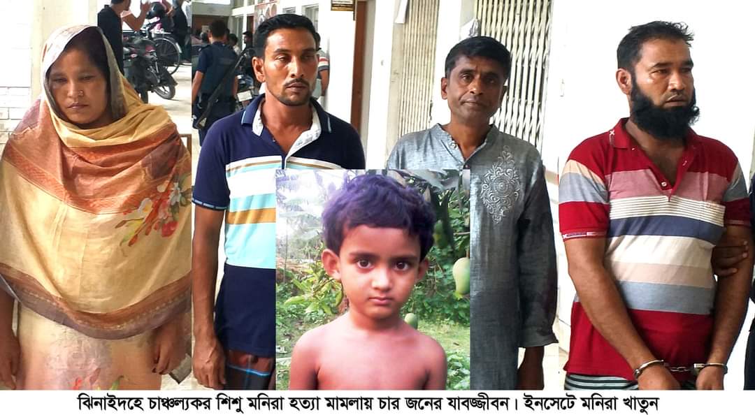 কামরুজ্জামান লিটন ঝিনাইদহ : ঝিনাইদহ সদর উপজেলার অচিন্তনগর গ্রামের ৫ বছরের শিশু মনিরা হত্যা মামলায় চার জনের যাবজ্জীবন কারাদন্ড দিয়েছে আদালত। রোববার দুপুরে ঝিনাইদহ জেলা ও দায়রা জজ আদালতের বিচারক মোঃ নাজিমুদ্দৌলা এ দন্ডাদেশ প্রদান করেন। দন্ডিতরা হলেন অচিন্তনগর গ্রামের আছালত মন্ডলের ছেলে জাফর মন্ডল (৪২) মৃত খয়বার বিশ^াসের ছেলে শিপন (৪০), কুদ্দুস মুন্সীর ছেলে মিন্টু মুন্সী (৪০) ও মুজিবার মোল্লার স্ত্রী নুপুর (৪০)। এই মামলার প্রধান আসামী আবু জাফর গ্রেফতারের পর পুলিশকে জানিয়েছিল মনিরার পিতা রমজান আলীর সাথে তাদের বিরোধ ছিল। এ ঘটনার সুত্র ধরে মনিরাকে তারা অপহরণ করে। এরপর তারা মনিরার পিতার কাছে মুক্তিপণ দাবী করে। টাকা না পেয়ে নৃশংস ভাবে হত্যা করে। হত্যার পর শিশু মনিরার হাত পা কেটে এসিডে ঝলসানো হয়। কারা কারা এই খুনের সাথে জড়িত তাও পুলিশকে জানায় আবু জাফর। ঘটনার চার দিন পর ১১ জুলাই অচিন্তনগরের একটি পাট ক্ষেতে মনিরার গলিত লাশ পাওয়া যায়। এ ঘটনায় সে সময় পুলিশ জিহাদ নামে এক মাদ্রাসা ছাত্রকে গ্রেফতার করে। জিহাদকে টাকার লোভ দেখিয়ে মনিরাকে বাড়ি থেকে ডেকে নিয়ে অচিন্তনগর গ্রামের মজিবর রহমানের স্ত্রী নুপুর খাতুনের হাতে তুলে দেয়। নুপুর শিশু মনিরাকে অচিন্তনগর গ্রামের আশাফুল, মোশাররফ ও আসালত মন্ডলের ছেলে জাফরের হাতে তুলে দেয়। কথিত আছে এই মামলা চলাকালে বাদী রমজান আলী মোটা অংকের টাকায় আসামীদের সঙ্গে আঁতাত করে। এ নিয়ে তার স্ত্রীর সঙ্গে বিবাদ সৃষ্টি হয়। স্ত্রী বাধ্য হয়ে ঝিনাইদহ সদর থানায় জিডি করেন। মামলার বাদীপক্ষের আইনজীবি ইশারত হোসেন খোকন জানান, শিশু মনিরাকে মুক্তিপণের দাবিতে অপহরণ করা হয়। অপহরণকারীরা শিশুটির বাবার কাছে মুক্তিপণ দাবী করলে ১১ জুলাই সদর থানায় অজ্ঞাতদের আসামী করে অপহরন মামলা দায়ের করা হয়। মামলার পরদিন তার বাড়ির পাশের পাট ক্ষেত থেকে শিশু মনিরার অর্ধগলিত লাশ উদ্ধার করে পুলিশ। পুলিশ তদন্ত শেষে ২০১৬ সালের ৩১ মার্চ ১০ জন অভিযুক্ত করে আদালতে চার্জশীট দাখিল করেন। দীর্ঘবিচারিক প্রক্রিয়া শেষে আদালত ওই মামলার অভিযুক্ত একই গ্রামে জাফর, শিপন, মিন্টু ও নুপুর বেগমকে যাবজ্জীবন কারাদন্ড প্রদান করেন। একই সাথে প্রত্যেককে ৫০ হাজার টাকা জরিমানা অনাদায়ে আরও এক বছরের কারদন্ড প্রদান করেন। মামলার অন্য আসামীদের বেকসুর খালাস দেওয়া হয়েছে।