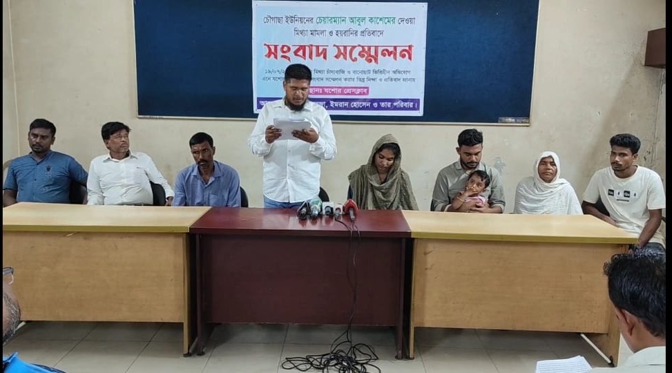 স্টাফ রিপোর্টার: যশোরের চৌগাছা উপজেলার চৌগাছা ইউনিয়নের চেয়ারম্যান আবুল কাশেমের বিরুদ্ধে সংবাদ সম্মেলন করেছে তিনটি পরিবার। দুপুর দেড়টায় প্রেসক্লাব যশোরে মিথ্যা মামলা ও পুলিশ দিয়ে হয়রানিসহ নানা অভিযোগ এনে সংবাদ সম্মেলন করেন তারা।