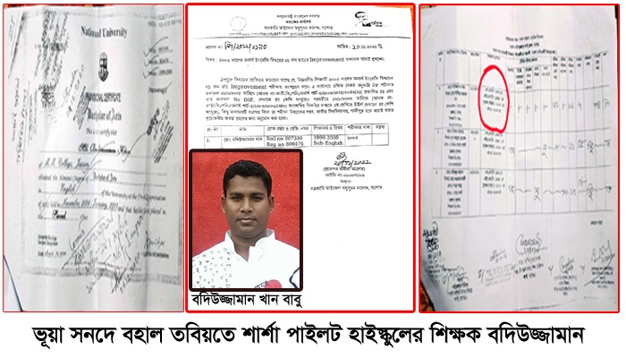 একটি সূত্র জানায়,শার্শা পাইলট হাইস্কুল কর্তৃক জাতীয় বিশ্ববিদ্যালয় গাজীপুরে সনদ যাচাই করতে গেলে সেখানে দেখা যায় যে বদিউজ্জামান খান (বাবু) অনার্সের ২য় শ্রেনির যে সার্টিফিকেট দাখিল করেছেন তা আসলে সঠিক নয়। সেখানে তার যে সার্টিফিকেট আছে সেটা নন-ইমপুরুভমেন্ট আছে। এবং তিনি ২য় শ্রেণির যে মার্কসিট প্রদান করেছেন তার সাথে ২০০৩ সালের আসল মার্কসিটের কোন মিল নেই। তিনি ৩টি বিষয়ের প্রতিটিতে ১০ মার্কস করে মোট ৩০ মার্কস বাড়িয়ে তার মার্কসিট এ অনার্স ১ম বর্ষে পার্ট-১ এ ৩৯ এর জায়গায় ৪৯ ও পার্ট-২ এ ৩৩ এর জায়গায় ৪৩ এবং অনার্স ২য় বর্ষে পার্ট-৩ এ ৩৮ এর জায়গায় ৪৮ করে একটা জাল মার্কসিট ও সার্টিফিকেট বানিয়ে চাকুরি নিয়েছিলেন। বর্তমানে বিদ্যালয়টি সরকারি আওতায় এসেছে এবং ৩০ জন শিক্ষকের এডহক নিয়োগ হয়েছে। কিন্তু জাল সার্টিফিকেটের জন্য বদিউজ্জামান খান (বাবুর) নিয়োগ আটকে আছে। বর্তমানে তার সার্টিফিকেট জালিয়াতির তদন্ত জেলা শিক্ষা অফিসে ঝুলছে। এবং বড় অংকের টাকার মাধ্যমে শিক্ষা মন্ত্রণালয় থেকে তার নিয়োগ করিয়ে আনার চেষ্টা চালিয়ে যাচ্ছে । তার সনদ যাচায়ের জন্য ২৭ অক্টোবর-২০২২ তারিখে মহাপরিচালক, মাধ্যমিক ও উচ্চ শিক্ষা অধিদপ্তর, বাংলাদেশ, ঢাকা হয়ে উপ-পরিচালক খুলনা অঞ্চল, খুলনাকে তদন্তভার প্রদান করা হয় এবং সেখান থেকে জেলা শিক্ষ অফিস যশোরকে তদন্তের দায়িত্বভার দেয়া হয় যার স্বারক নং-৩৭,০২,৪১০০,০০১, ১৮,০০৫,১৭,১০৫০। বর্তমানে তিনি সেখানেও ক্ষমতা দেখিয়ে সেটা ধামাচাপা দিয়ে রেখেছেন। এছাড়াও এম এম কলেজের অধ্যক্ষ মর্জিনা আক্তারের নিকট থেকে সনদ সক্রান্ত একটি প্রত্যায়ন পত্র নিতে গেলে তার সন্দেহ হলে তিনি প্রত্যায়ন পত্র না দিয়ে ২০/১১/২০২২ইং তারিখে পরীক্ষা নিয়ন্ত্রন দপ্তর জাতীয় বিশ্ববিদ্যালয় গাজীপুরে পাঠান যার স্মারক নং-পি/২০২২/১১৯০।
