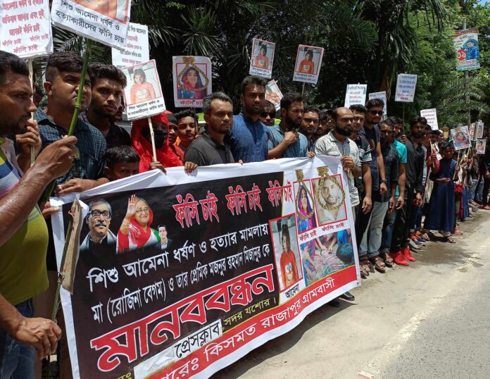 কাগজ সংবাদ : যশোরের কিসমত রাজাপুরের শিশু আমেনা হত্যার বিচার চেয়ে রাজপথে নেমেছে বিক্ষুব্ধ এলাকাবাসী। তারা আমেনার মা রজিনা বেগম ও তার পরকীয়া প্রেমিক মজনুর রহমানের ফাঁসির দাবিতে মানববন্ধন ও বিক্ষোভ করেছেন। সোমবার দুপুরে প্রেসক্লাব যশোরের সামনে তারা এ কর্মসূচী পালন করেন।