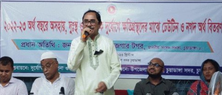বুধবার বেলা সাড়ে ১০টার দিকে চুয়াডাঙ্গা সদর উপজেলা পরিষদের উদ্যোগে দুর্যোগ ব্যবস্থাপনা ও ত্রাণ মন্ত্রণালয়ের বাস্তবায়নে উপজেলা চত্বরে আয়োজিত ঢেউটিন ও নগদ অর্থ বিতরণ অনুষ্ঠানে সভাপতিত্ব করেন সদর উপজেলা নির্বাহী কর্মকর্তা শামীম ভূইয়া।প্রধান অতিথি হিসেবে উপস্থিত ছিলেন চুয়াডাঙ্গা-২ আসনের সংসদ সদস্য আলী আজগার টগর।প্রধান অতিথি সাংসদ আলী আজগর টগর এসময় উপকারভোগী ৩৭ জনের ৪২ বান্ড ঢেউটিন ও নগদ ১ লাখ ২৬ হাজার টাকা বিতরণ করেন। তিনি এসময় বলেন, বর্তমান সরকার জনগণের সরকার।এসরকার অসহায় মানুষের ভাগ্য উন্নয়নে কাজ করে যাচ্ছে। অনুষ্ঠানে বিশেষ অতিথি হিসেবে উপস্থিত ছিলেন সদর উপজেলা পরিষদের চেয়ারম্যান আসাদুল হক বিশ্বাস, মহিলা ভাইস চেয়ারম্যান শাহাজাদী মিলি ও প্রকল্প বাস্তবায়ন কর্মকর্তা এনামুল হক।