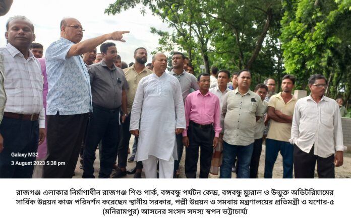 হেলাল উদ্দিন, রাজগঞ্জ : যশোরের মনিরামপুর উপজেলার রাজগঞ্জ এলাকার নির্মাণাধীন রাজগঞ্জ শিশু পার্ক, বঙ্গবন্ধু পর্যটন কেন্দ্র, বঙ্গবন্ধু ম্যুরাল ও উন্মুক্ত অডিটরিয়ামের সার্বিক উন্নয়ন কাজ পরিদর্শন করেছেন স্থানীয় সরকার, পল্লী উন্নয়ন ও সমবায় মন্ত্রণালয়ের প্রতিমন্ত্রী ও যশোর-৫ (মনিরামপুর) আসনের সংসদ সদস্য স্বপন ভট্টাচার্য্য।