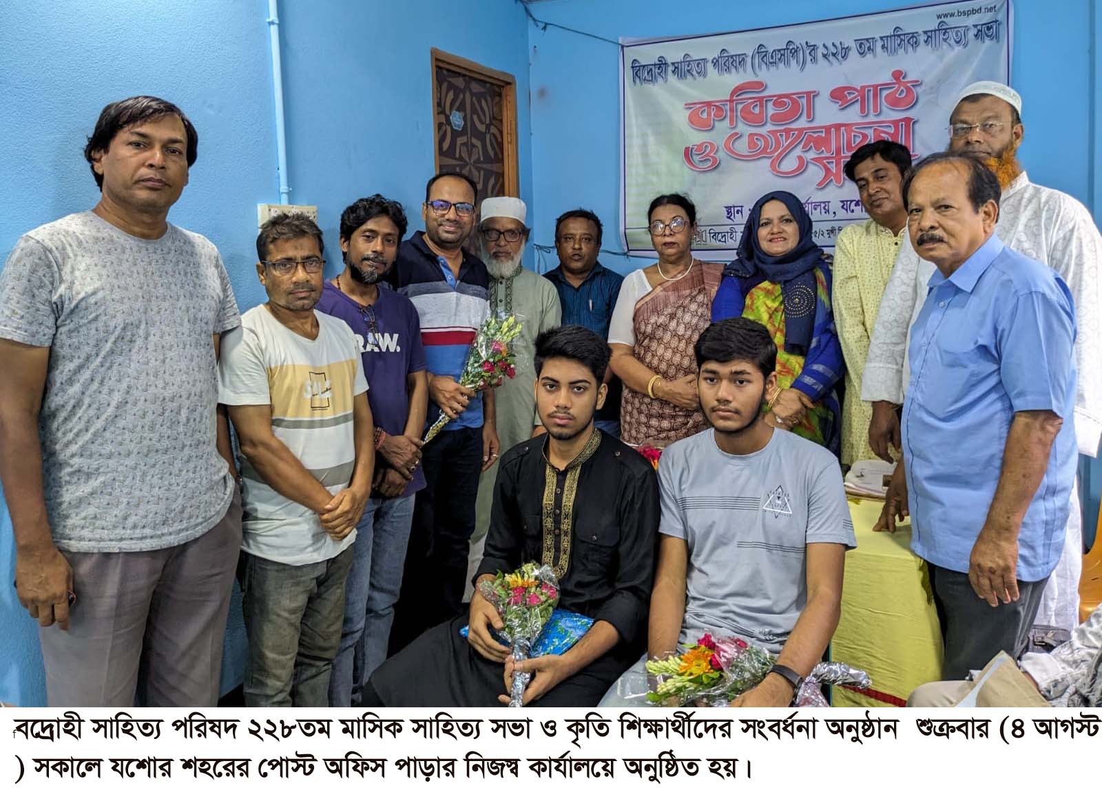 স্টাফ রিপোর্টার : বিদ্রোহী সাহিত্য পরিষদ (বিএসপি) ২২৮তম মাসিক সাহিত্য সভা ও কৃতি শিক্ষার্থীদের সংবর্ধনা অনুষ্ঠান শুক্রবার (৪ আগস্ট ২০২৩) সকালে যশোর শহরের পোস্ট অফিস পাড়ার নিজস্ব কার্যালয়ে অনুষ্ঠিত হয়। এতে আলোচক হিসেবে উপস্থিত ছিলেন বিশিষ্ট কবি ও গবেষক ড. সবুজ শামীম আহসান, কবি ও সাহিত্যিক মিলা মাহফুজা, কবি ড. শাহনাজ পারভীন, অ্যাড.জিএম মুছা, কবি এমএনএস তুর্কি। অতিথি হিসেবে উপস্থিত ছিলেন শতাব্দী সাহিত্য ও গবেষণা পরিষদের সভাপতি, কবি ও গবেষক কাজী শওকত শাহী, সাবেক সভাপতি এডিএম রতন।