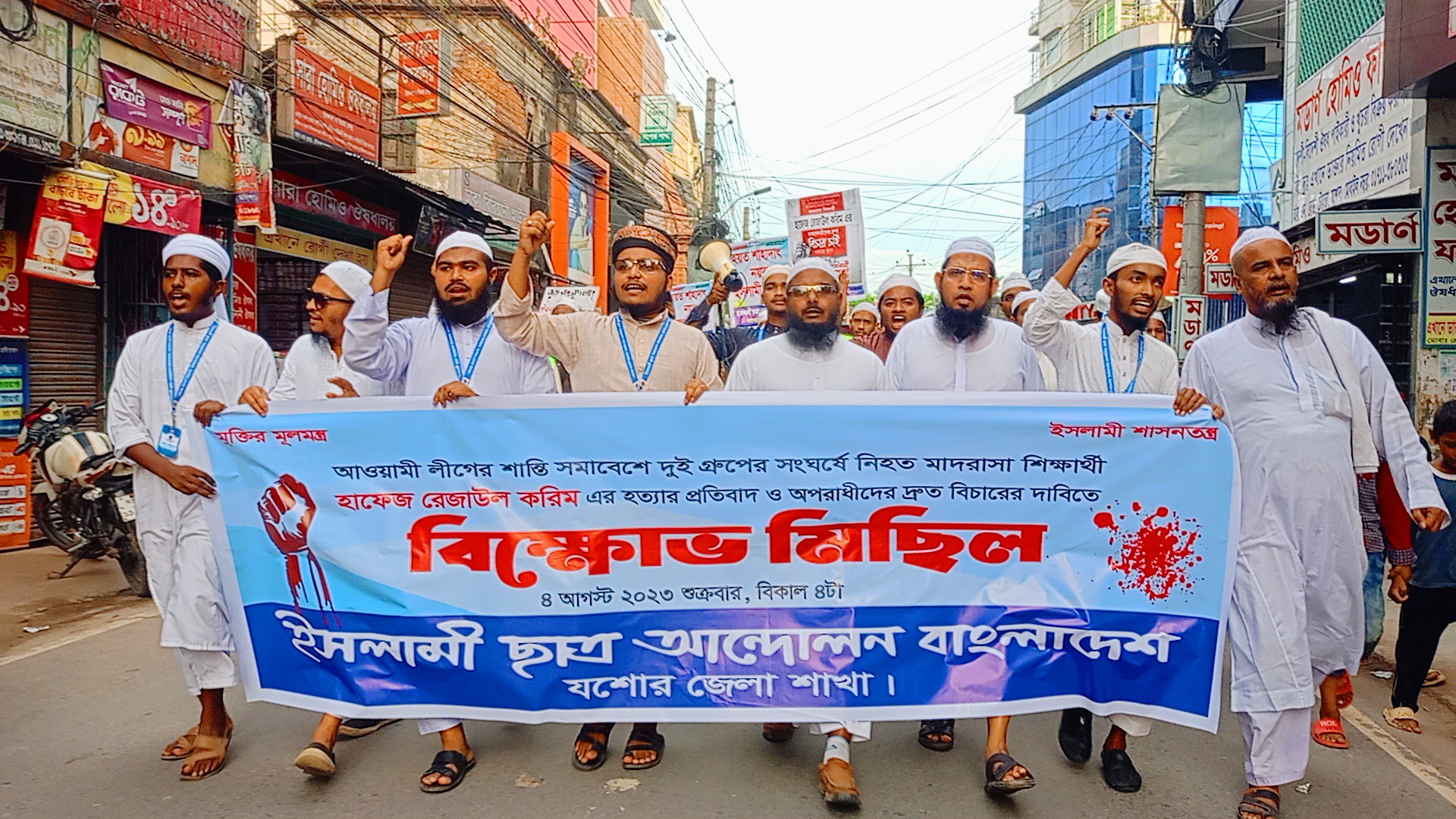শুক্রবার (৪ আগস্ট) বিকাল ৪ টায়, ইসলামী ছাত্র আন্দোলন বাংলাদেশ যশোর জেলা শাখার ব্যবস্থাপনায় জেলা সভাপতি মুহাম্মাদ আব্দুল আওয়াল এর সভাপতিত্বে ও সাধারণ সম্পাদক মুহাম্মাদ ফয়েজ গাজীর সঞ্চালনায় হাফেজ রেজাউল করিম এর হত্যাকারীদের বিচারের আওতায় আনার দাবিতে বিক্ষোভ মিছিল অনুষ্ঠিত হয়।