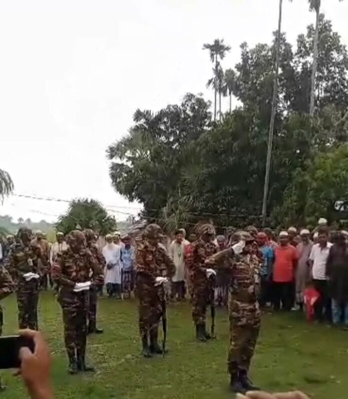 জাহিদ,মনিরামপুর (যশোর)প্রতিনিধিঃ-যশোর মনিরামপুর ঢাকুরিয়া ইউনিয়নের প্রতাপকাটি গ্রামের অবসর প্রাপ্ত সেনা সদস্য আব্দুল গফফার পিতা মৃতঃ আব্দুল গনি সরদার, ৬আগষ্ট ২০২৩তারিখে অসুস্হতা(ষ্ট্রোক) জনিত কারনে ঢাকা সম্মিলিত সামরিক হাসপাতালে আনুমানিক বিকাল ৩ঘটিকার সময় মৃত্যুবরন করেন।নিজ বাড়িতে মরদেহ আনুমানিক রাত ১২টারর সময় আনা হয়।মরদেহ বাড়িতে আসার পরে এলাকাতে শোকের ছায়া পড়ে যায়।মরহুমের জানাযা নিজ এলাকাতে অনুষ্ঠিত হয়।জানাযা শেষে পারিবারিক কবর স্হানে রাষ্ট্রীয় মর্যাদায় দাফন করা হয়। যশোর সেনানিবাস ৫৫ পদাতিক ডিভিশনের পক্ষ থেকে ৩৭ বীর এর চৌকস সেনাদল গার্ড অফ অনার প্রদান করেন এবং বিগোলের করুনসুর বাজিয়ে অন্তিম সজ্জায় শায়িত করেন এবং দাফন বাবদ নগদ দশ হাজার টাকা প্রদান করেন। পাশাপশি শোকাহত পরিবারের সদস্য দের সমবেদনা ও সহমর্মিতা প্রদান করেন। মরহুমের জানাযাতে মনিরামপুর উপজেলার অবসরপ্রাপ্ত সশস্ত্র বাহিনী কল্যান সংস্হার উপদেষ্টা মন্ডলীর সদস্য সহ বিপুল সংখ্যক অবসর প্রাপ্ত সেনা সদস্যরা অংশ গ্রহন করেন এবং শোকাহত পরিবার কে সমবেদনা জানান।