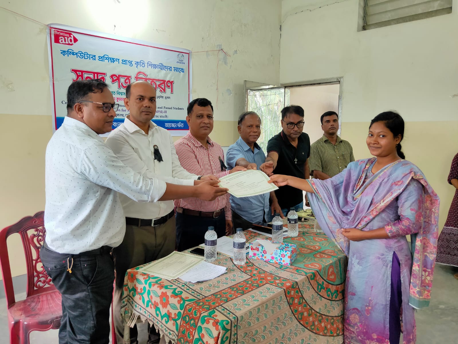 ভ্রাম্যমান প্রতিনিধি , ডুমুরিয়া (খুলনা) : খুলনার ডুমুরিয়া উপজেলার চুকনগর ক্যাথলিক মিশনে দলিত সংস্থার আয়োজনে খ্রীষ্টিয়ান এইড বাংলাদেশের র্অথায়নে কম্পিউটার প্রশিক্ষণপ্রাপ্ত কৃতি শিক্ষার্থীদের মাঝে সনদপত্র বিতরণ করা হয়েছে। সোমবার বেলা ১১টার সময় সনদপত্র বিতরণ অনুষ্ঠানের সভায় সভাপতিত্ব করেন দলিত সংস্থার নির্বাহী পরিচালক স্বপন কুমার দাস। প্রধান অতিথি ছিলেন উপজেলা সমাজসেবা কর্মকর্তা সুব্রত বিশ্বাস। বিশেষ অতিথি ছিলেন যুব উন্নয়ন র্কমর্কতা এস এম কামরুজ্জামান ও ক্যথলিক মিশনের ফাদার ডেভিড রকি গমেজ। বক্তব্য রাখেন শিক্ষা সুপারভাইজার সুধাংশ দাস , কম্পিউটার প্রশিক্ষক বাধন কুমার পাল , সহকারী টেকনিক্যাল অফিসার আনজুমানারা আঁখি প্রমূখ। দলিত সংস্থার কর্মসূচী প্রধান বিকাশ দাসের পরিচালনায় অনুষ্ঠিত সভায় শতাধিক কৃতি শিক্ষার্থীদের মাঝে কারিগরি শিক্ষা র্বোড থেকে প্রাপ্ত সনদপত্র বিতরণ করা হয়।