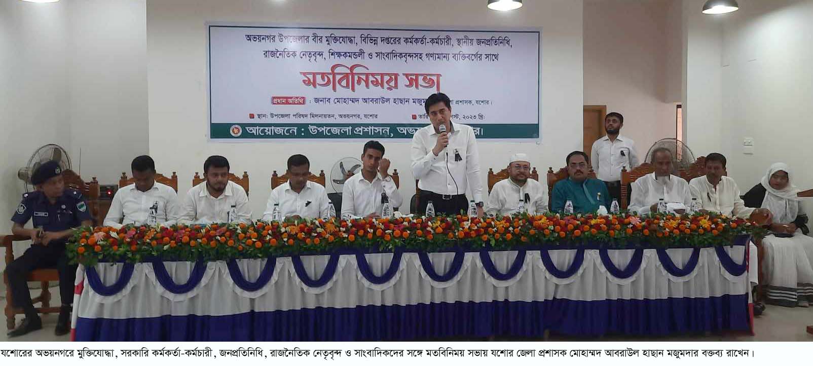 অভয়নগর (যশোর) প্রতিনিধি : যশোরের অভয়নগরে মুক্তিযোদ্ধা, বিভিন্ন দপ্তরের কর্মকর্তা-কর্মচারী, স্থানীয় জনপ্রতিনিধি, রাজনৈতিক নেতৃবৃন্দ, শিক্ষকমন্ডলী, সাংবাদিকবৃন্দসহ গণ্যমান্য ব্যক্তিবর্গের সঙ্গে মতবিনিময় সভা অনুষ্ঠিত হয়েছে। উপজেলা প্রশাসনের আয়োজনে গতকাল বুধবার দুপুরে উপজেলা পরিষদ মিলনায়তনে এ মতবিনিময় সভা অনুষ্ঠিত হয়।