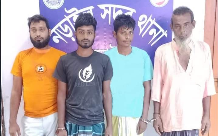 হত্যা মামলার প্রধান আসামিসহ গ্রেফতার চারজন। জমিজমা সংক্রান্ত বিরোধের জেরে রাধা বল্লব বিশ্বাস (৭০) নামের এক ব্যক্তি হত্যাকাণ্ডের শিকার হয়েছে। সে নড়াইল সদর থানার দেবভোগ গ্রামের রাম মোহন বিশ্বাসের ছেলে। গত (১৬ আগস্ট) রাধা বল্লব নামের ঐ ব্যক্তি তার দখলীয় জমিতে পাট কাটতে যায়। ফলে পূর্বশত্রুতার জেরে কতিপয় ব্যক্তি দেশীয় অস্ত্রসস্ত্র নিয়ে তার উপর হামলা করে। এতে সে গুরুতর জখম হয়। পরে স্থানীয় লোকজন রাধা বল্লবকে দ্রুত নড়াইল সদর হাসপাতালে ভর্তি করে। চিকিৎসাধীন অবস্থায় ঐ দিন সে হাসপাতালে মারা যায়। এ ঘটনায় রাধা বল্লবের ভাইপো বাদী হয়ে (১৮ আগস্ট) নড়াইল সদর থানায় এজাহার দায়ের করলে হত্যা মামলা রুজু হয়। ঘটনার সাথে সাথে নড়াইল জেলা পুলিশ সুপার মোসাঃ সাদিরা খাতুন নির্দেশনায় অত্র এলাকায় পুলিশি টহল জোরদার করা হয় এবং আসামি গ্রেফতারের জন্য তৎপর হয় পুলিশ। অতিরিক্ত পুলিশ সুপার (সদর সার্কেল) দোলন মিয়া এর নেতৃত্বে অদ্য ২০ আগস্ট এজাহারনামীয় ১ নং আসামি আলম শেখ (২৭), পিতা-সালাম শেখ, ২ নং আসামি সালাম শেখ (৫০), পিতা-মৃত লাল মিয়া শেখ, ৫ নং আসামি ইমরান শেখ (৩৫) ও ৬ নং আসামি ইমন শেখ (২২), উভয় পিতা-সালাম শেখ, সর্ব সাং-বাহির গ্রাম, থানা ও জেলা- নড়াইলগণকে গ্রেফতার করতে সক্ষম হয় সদর থানা পুলিশ।