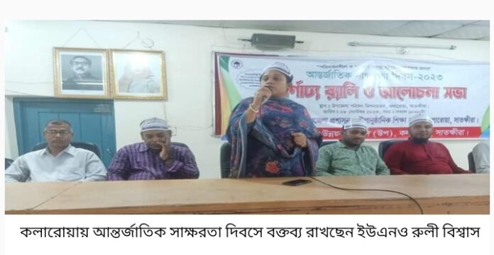 এম,এ সাজেদ,, কলারোয়া( সাতক্ষীরা) প্রতিনিধি: কলারোয়ায় আন্তর্জাতিক সাক্ষরতা দিবস-২৩’ পালিত হয়েছে। উপজেলা প্রশাসন ও উপানুষ্ঠানিক শিক্ষা ব্যুরোর আয়োজনে শুক্রবার( ৮ সেপ্টেম্বর) সকাল ১০ টায় দিবসটি পালনে বর্ণাঢ্য র্যালি ও আলোচনা সভা অনুষ্ঠিত হয়। ‘পরিবর্তন ও শান্তিপূর্ণ সমাজ গঠনে সাক্ষরতার প্রসার’ এই প্রতিপাদ্যকে সামনে রেখে উন্নয়ন পরিষদ(উপ) সহযোগীতায় কোমলমতি শিক্ষার্থীদের উপস্থিতিতে বর্ণাঢ্য র্যালিটি উপজেলা পরিষদের গুরুত্বপূর্ণ স্থান পরিদক্ষণ করে আলোচনা সভায় সমাবেত হয়। উপজেলা পরিষদ মিলনায়তনে অনুষ্ঠিত আলোচনা সভায় সভাপতিত্ব করেন উপজেলা নির্বাহী অফিসার( ইউএনও) রুলী বিশ্বাস। সভায় অন্যান্যদের মধ্যে অতিথি হিসাবে বক্তব্য রাখেন ও উপস্থিত ছিলেন সহকারী শিক্ষা অফিসার আশিকুজ্জামান, কলারোয়া মডেল সরকারি প্রাথমিক বিদ্যালয়ের প্রধান শিক্ষক মুজিবর রহমান, প্রধান শিক্ষিকা রেহেনা খাতুন, সহকারী শিক্ষক অনুপ কুমার ঘোষ, হাবিবুর রহমান, সাবিনা ইয়াসমিন, রবিউল ইসলাম সহ অনুষ্ঠানের সহযোগী সংস্থা উন্নয়ন পরিষদের কর্মকর্তাগণ, সূধি, সাংবাদিক ও কোমলপ্রাণ ছাত্র- ছাত্রীবৃন্দ। উল্লেখ্য, সাক্ষরতা বিস্তারে স্বাধীনতা লাভের পর ১৯৭২ সালে স্বাধীন বাংলাদেশে প্রথমবারের মতো সাক্ষরতা দিবস উৎযাপিত হয়েছে বলে জানা যায়। দিবসটি থেকে নিরক্ষরতা দূরীকরণ এবং শিক্ষাকে অবৈতনিক ও বাধ্যতামূলক হিসাবে ঘোষনা করা হয়।