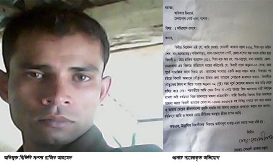 সোনালী আক্তার বকুল আরো জানান, আমি বেনাপোলে একটি ওয়ালটন শোরুমে চাকরি করতাম। আর রাজিব আহমেদ ২৩ বিজিবি খুলনায় কর্মরত ছিলেন। রাজিব আহমেদ চাকরির সুবাদে বেনাপোলের একটি বিজিবি ক্যাম্পে কর্মরত থাকাকালীন সময় এখানে তাদের মধ্যে প্রেম হয়। এরপর তাকে ওই সময় ফুসলিয়ে ময়মনসিংহ জেলার ত্রিশাল উপজেলার একটি কাজী অফিসে নিয়ে গিয়ে ২০১৬ সালের ৪ ফেব্রুয়ারি রেজিস্ট্রি বিয়ে করে। এরপর তারা স্বামী স্ত্রী হিসেবে রাজিবের নেত্রকোনার বাড়িতে বসবাস করতে থাকেন। এরপর যৌতুকের দাবিতে মারপিট করতে থাকে। কয়েক বছর ঘর সংসার করার পরে একটি কন্যা সন্তানের জননী হলে তাকে যৌতুকের টাকার জন্য চাপ ও মারপিট করে নির্যাতন চালিয়ে শিশুকন্যাসহ তাকে তাড়িয়ে দেয়। একপর্যায়ে গত২০২০ সালে রাজিবের নতুন কর্মস্থল ফেনির ৪ বিজিবি ব্যাটেলিযানের গেটে গিয়ে সন্তান নিয়ে হাজির হয়। এসময় সোনালী আক্তার বকুলের বয়স পূর্ন না হওয়ায় বিজিবির অনুমতি সাপেক্ষে বিজিবির অধিনায়ক রাজিব আহমেদ ও সোনালী আক্তার বকুলকে তাদের বয়স অনুযায়ী বিয়ে করার পরামর্শ দেন ও পরে কাগজপত্র অনুমতি নিয়ে তারা বিয়ে করে সেখানে সরকারি পারিবারিক বাসস্থানের সুযোগ-সুবিধা নিয়ে বসবাস করতে থাকেন। সেখানে সরকারি পারিবারিক বাসস্থানের অনুমতির মেয়াদ শেষ হলে রাজিব আহমেদ তার গ্রামের বাড়ি নেত্রকোনায় নিয়ে রেখে আসে। সেখানে রাজিব আহমেদ ছুটিতে এসে দফায় দফায় আবার তার ওপরে চালাতো নির্যাতন। শুধু বাড়িতে নয় ফেনী বিজিবির সরকারি পারিবারিক বাসস্থানেও থাকাকালীন সময়ে বকুলের ওপর চলতো অমানুষিক নির্যাতন। একপর্যায়ে বাড়ি থেকে শিশুকন্যাসহ বকুলকে নির্যাতন চালিয়ে তাড়িয়ে দেয়। কোন উপায়ান্তর না পেয়ে শেষ পর্যন্ত সোনালী আক্তার বকুল, বিজিবির মহাপরিচালক বরাবর বিজিবি সদস্য তার স্বামী রাজীব আহমেদের নির্যাতন এর বর্ণনা দিয়ে একটি অভিযোগ করেন। কিন্তু তার কোন বিচার আজও পর্যন্ত সোনালী আক্তার বকুল পায়নি। শেষ পর্যন্ত কোন উপায় না পেয়ে সোনালী আক্তার বকুল যশোর সিনিয়র জুড়িসিয়াল ম্যাজিস্ট্রেট বেনাপোল পোর্ট আমলী আদালত যশোরে ২০২১ সালের ১০ ডিসেম্বর নারী নির্যাতন দমন আইনে মামলা করেন। এ মামলা তুলে নেয়ার মোবাইল ফোনে রাজিব আহমেদ হুমকি দিয়ে বলেছেন, মামলা তুলে না নিলে বকুল ও তার মেয়েকে খুন করে লাশ গুম করা হবে। এ ব্যাপারে রাজিব আহমেদের সাথে যোগাযোগ করা হলে তিনি কোন কথা বলতে রাজি নন।