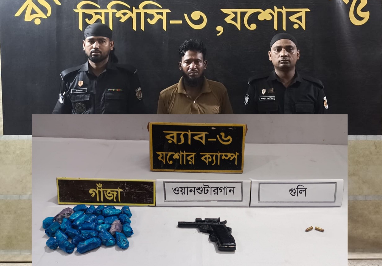 কাগজ সংবাদ : যশোরে র‌্যাবের অভিযানে নিজ বাড়ি থেকে অস্ত্র ও মাদকসহ এক সন্ত্রাসীকে আটক করেছে র‌্যাব-৬ যশোরের সদস্যরা। আটক জসিম যশোর সদর উপজেলার মাহিদিয়া গ্রামের একরামুলের ছেলে। মঙ্গলবার গভীর রাতে যশোর সদর উপজেলার মাহিদিয়া গ্রামের বাড়ি থেকে তাকে আটক করা হয়। এরপর তার কাছথেকে ২৯ পুরিয়া গাজা ও একটি ওয়ানশুটারগান এবং দুই রাউন্ড গুলি উদ্ধার করা হয়। তার বিরুদ্ধে একটি অস্ত্র ও সাতটি মাদক মামলা রয়েছে।