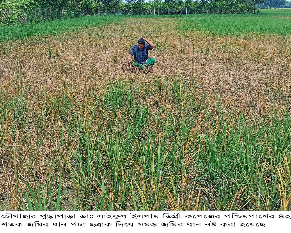 চৌগাছা-মহেশপুর সীমান্তে অবস্থিত ডাঃ সাইফুল ইসলাম কাঠগড়া ডিগ্রী কলেজ। অনেকে পুড়াপাড়া কাঠগড়া কলেজ বলেও চেনেন। এই কলেজের গা ঘেষে পশ্চিম পাশে ৪২ শতক জমি আছে মহেশপুর উপজেলার ভাটপাড়া গ্রামের সুলতান মিয়ার ছেলে কৃষক জহির রায়হানের। প্রতি বছর সমুদয় জমিতে যে পরিমান ধান উৎপাদন হয় তাতে বছরের মোট চালের অর্ধেক ঘরে আসে। চলতি আমন মৌসুমে কৃষক জহির রায়হান সমুদয় জমিতে বি-৫১ উন্নত জাতের ধান চাষ করেন। ইতোমধ্যে ধানে থোড় চলে এসেছে। ভালো ফলন হবে, সেই ধান হতে কিছু বিক্রি করে সংসারের অন্য খরচ বহন করবে এ ধরনের নানা স্বপ্নে বিভোর ছিলেন কৃষক জহির রায়হান। কিন্তু সম্প্রতি এক রাতে কে বা কারা পচননাশক বিষ সমুদয় ধান ক্ষেতে স্প্রে করে সব ধান মেরে ফেলেছে। প্রথমে ধানের গাছ হলুদ রং ধারন করে এরপর দু’একের মধ্যে প্রতিটি গাছ পচে গলে মাটিতে লুটিয়ে পড়ে। খবর পেয়ে স্থানীয় চাষিসহ মহেশপুর উপজেলা কৃষি অফিসও ঘটনাস্থল ওই মাঠ পরিদর্শন করেন এবং সকলেই এই ঘৃন কাজের জন্য ধিক্কার জানান।