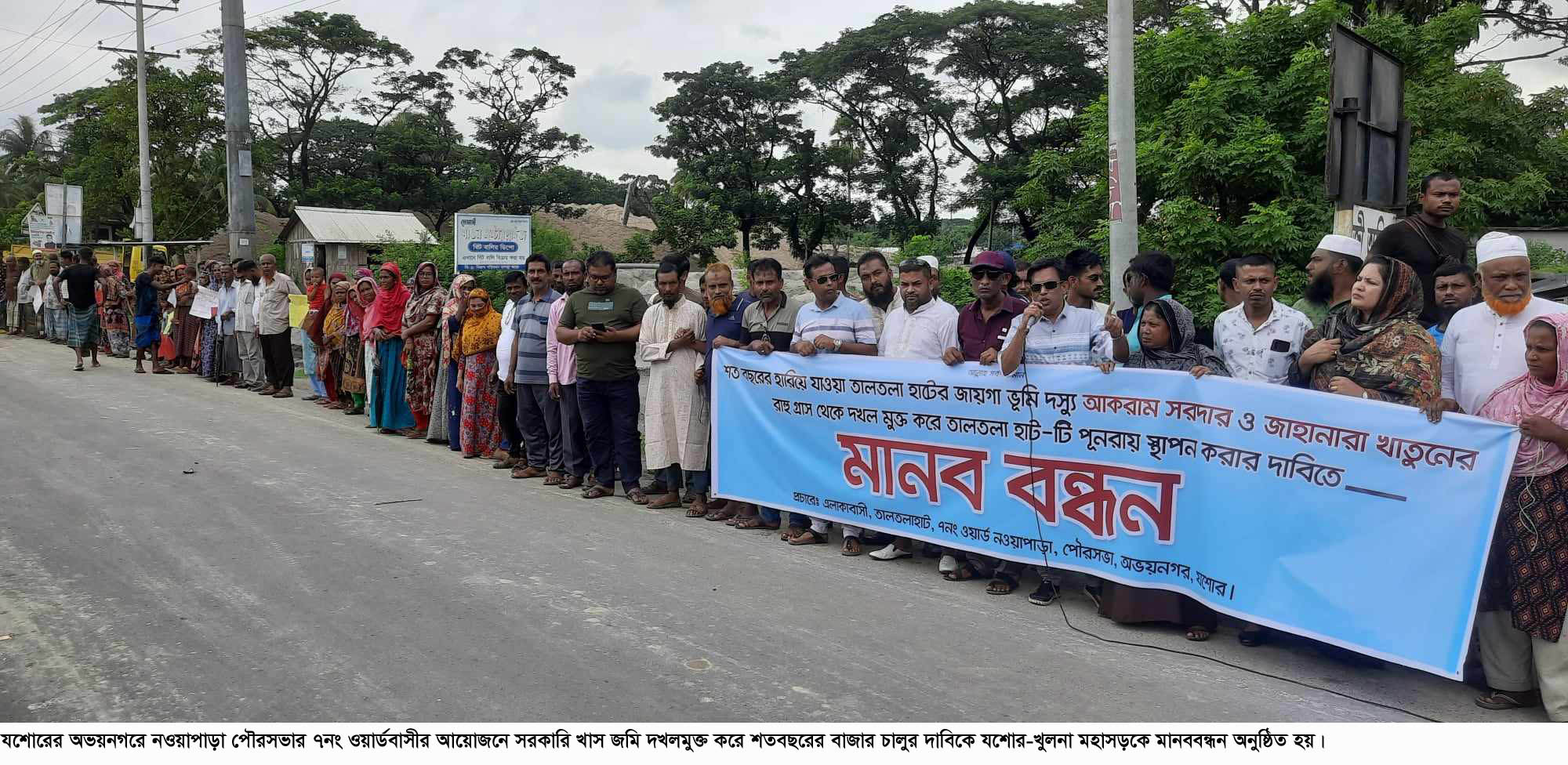 বুধবার (২০ সেপ্টেম্বর) দুপুরে পৌরসভার ৭নং ওয়ার্ডবাসীর আয়োজনে যশোর-খুলনা মহাসড়কের তালতলা নামক স্থানে এ মানববন্ধন অনুষ্ঠিত হয়। মানববন্ধন চলাকালে বক্তারা নতুন কর্মসূচি ঘোষণা করেন। এরআগে গত সোমবার (১৮ সেপ্টেম্বর) একই দাবিতে ওয়ার্ডবাসী নওয়াপাড়া প্রেসক্লাবে সংবাদ সম্মেলন করে।