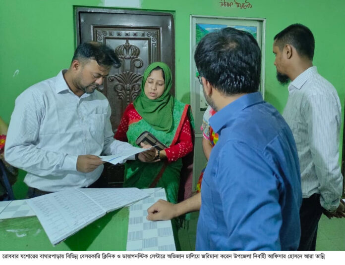 রোববার সকালে উপজেলা নির্বাহী অফিসার ও নিবার্হী ম্যাজিস্ট্রেট হোসনে আরা তান্নি ও সহকারি কমিশনার (ভূমি) পৃথক পৃথক পৃথক অভিযান পরিচালনা করেন। এসময় বাঘারপাড়া চৌরাস্তার আনোয়ার ক্লিনিকে ৫০০০ টাকা, ফাতেমা ক্লিনিকে ২০০০ টাকা, বাঘারপাড়া ক্লিনিকে ২০০০ টাকা ও ল্যাব কেয়ার ডায়াগনস্টিক সেন্টারে ৫০০ টাকা জরিমানা করা হয়। এসময় উপস্থিত ছিলেন বাঘারপাড়া উপজেলা স্বাস্থ্য কর্মকর্তা ডা: অরূপ জ্যোতি ঘোষ, আবাসিক মেডিকেল অফিসার ডা: খায়রুল আল মুদাচ্ছির, মেডিকেল অফিসার ডা:শাহজালাল , স্যানেটারী ইন্সপেক্টর মনিরা খাতুনসহ পুলিশ প্রশাসনের সদস্যরা উপস্থিত ছিলেন।
