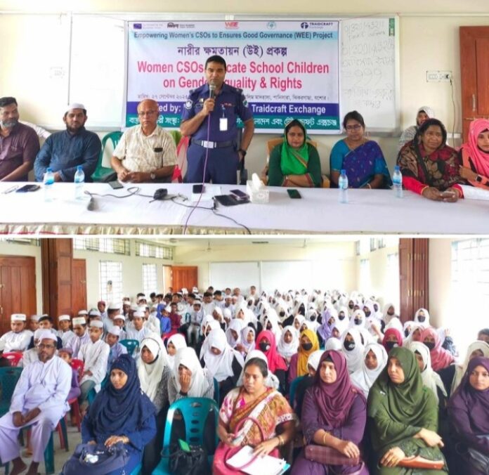 ঝিকরগাছা (যশোর) প্রতিনিধি : যশোরের ঝিকরগাছা উপজেলার বেজিয়াতলা আলিম মাদ্রাসার শিক্ষার্থীদের নিয়ে নারীর অধিকার বিষয়ক কর্মশালা অনুষ্ঠিত হয়েছে। ইউরোপিয়ান ইউনয়িন ও ট্রেডক্রাফট্ এক্সচেঞ্জ এর র্অথায়নে, উলাসী সৃজনী সংঘ, বিকাশ বাংলাদেশ ও ট্রেডক্রাফট্ এক্সচেঞ্জ এর বাস্তবায়নে যশোরের ঝিকরগাছায় নারীর ক্ষমতায়ন শীর্ষক প্রকল্পের আওতায় জেন্ডার সমতা ও নারীর অধিকার বিষয়ক সচেতনতা বৃদ্ধির লক্ষে বৃহস্পতিবার দুপুরে ঝিকরগাছার পানিসারা ইউনিয়নের বেজিয়াতলা আলিম মাদ্রাসায় এই কর্মশালা অনুষ্ঠিত হয়। অনুষ্ঠানে প্রধান অতিথির বক্তব্য রাখেন, ঝিকরগাছা থানার অফিসার ইনচার্জ সুমন ভক্ত। উপজেলা নারী সামাজিক এসোসিয়েশনের সভাপতি মাফরুহা আকবার শিল্পীর সভাপতিত্বে উক্ত অনুষ্ঠানে বিশেষ অতিথি ছিলেন, উলাশী সৃজনী সংঘের নির্বাহী পরিচালক খন্দকার আজিজুল হক মনি, উপজেলা মহিলা ভাইস চেয়ারম্যান লুবনা তাক্ষী, উপজেলা মহিলা বিষয়ক কর্মকর্তা অনিতা মল্লিক, সহকারি শিক্ষা অফিসার মোঃ সাহিদুল ইসলাম, বেজিয়াতলা আলিম মাদরাসার অধ্যাক্ষ মোঃ দ্বীন ইসলাম, উলাসী সৃজনী সংঘের নারীর ক্ষমতায় প্রকল্পের রিজিওনাল কো-অর্ডিনেটর কৃষিবীদ হারুণ অর রশিদ, উপজেলা ফিল্ড কো-অর্ডিনেটর নার্গিস আক্তার, উপজেলা নারী সামাজিক এ্যাসোসিয়েশনের সাধারণ সম্পাদক নাসরিন সুলতানা, ইউপি সদস্য তরুনা বেগম, পানিসারা মোড়লপাড়া নারী সামাজিক সমিতির সভাপতি মারুফা খাতুন প্রমুখ। এসময় উপজেলা নারী সামাজিক এসোসিয়েশনের সকল সদস্যবৃন্দসহ মাদ্রাসার প্রায় সাড়ে ৪শতাধিক শিক্ষার্থীসহ শিক্ষক/শিক্ষিকা মন্ডলী উপস্থিত ছিলেন।