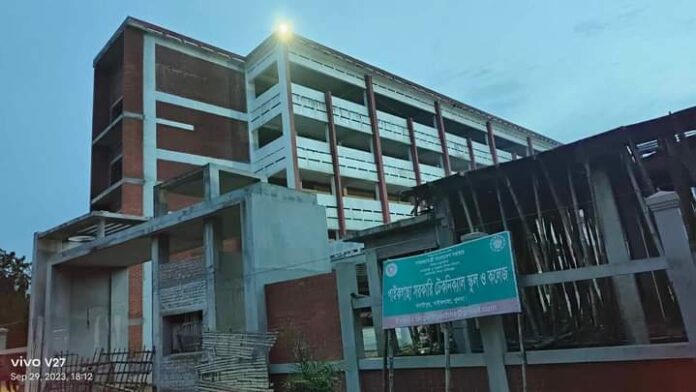 জি এ গফুর, পাইকগাছা। পাইকগাছা উপজেলার গদাইপুরে নির্মাণাধীন পাইকগাছা সরকারি টেকনিক্যাল স্কুল ও কলেজের নির্মাণ কাজ দীর্ঘ ৫ বছরেও শেষ করতে পারেনি সংশ্লিষ্ট ঠিকাদারি প্রতিষ্ঠান। মূল ৫তলা বিশিষ্ট অ্যাকাডেমিক ভবন ও ৪তলা বিশিষ্ট ওয়ার্কশপ ভবনের নির্মাণ কাজ শেষ হয়েছে। এখন চলছে পানি ও বৈদ্যুতিক লাইনের কাজ। সবমিলিয়ে এ পর্যন্ত ৯০ শতাংশ কাজ শেষ হয়েছে এবং চলতি বছরের মধ্যে বাকি কাজ সম্পন্ন করা হবে বলা হলেও আশঙ্কা রয়েছে।জানা গেছে, তৎকালীন সংসদ সদস্য আলহাজ শেখ নূরুল হকের ঐকান্তিক প্রচেষ্টায় উপজেলার গদাইপুর ফুটবল ময়দানের অপরপাশে খুলনা-পাইকগাছা সড়কের গা ঘেঁষে এক একর জমি অধিগ্রহণ করা হয় পাইকগাছা সরকারি টেকনিক্যাল স্কুল ও কলেজ নির্মাণের জন্য । ২০১৮ সালের শেষের দিকে ১৫ কোটি ৪৭ লাখ ৪৬ হাজার ৬২৮ টাকায় সরকারি টেকনিক্যাল স্কুল ও কলেজের নির্মাণ কাজ শুরু করেছিল ঠিকাদারি প্রতিষ্ঠান মেসার্স মধু ট্রেডার্স ।দেড় বছর অর্থাৎ ২০২০ সালের মাঝামাঝি সময়ের মধ্যে নির্মাণ কাজ শেষ করার কথা থাকলেও বিভিন্ন জটিলতার কারণে আজও নির্মাণ কাজ শেষ করতে পারেনি ঠিকাদারি প্রতিষ্ঠান ।এ প্রসঙ্গে সংশ্লিষ্ট ঠিকাদারি প্রতিষ্ঠানের প্রকৌশলী আব্দুস সালাম জানান, বৈদ্যুতিক খুঁটির কারণে নির্দিষ্ট সময়েরও প্রায় ৬ মাস পর নির্মাণ কাজ শুরু করা হয়েছিল । তারপর করোনার কারণে প্রায় ১ বছর নির্মাণ কাজ বন্ধ রাখা হয়েছিল ।এসব কারণে নির্মাণ কাজ পিছিয়ে গেছে। পরবর্তীতে সময় বর্ধিত করে ২০২৩ সালের মধ্যে নির্মাণ কাজ সম্পন্ন করার কথা রয়েছে । মূল অ্যাকাডেমিক ভবন ৫তলা ও ওয়ার্কশপ ভবন ৪তলা বিশিষ্ট ভবন দুটির নির্মাণ সম্পন্ন হয়েছে।আর একটি তিন কক্ষ বিশিষ্ট একতলা সার্ভিস এরিয়া ভবন নির্মাণ কাজ চলমান রয়েছে । ইতিমধ্যে ৯০ শতাংশ সম্পন্ন করা হয়েছে বলে ঠিকাদারি প্রতিষ্ঠানের প্রকৌশলী আব্দুস সালাম দাবি করেন ।শনিবার সরেজমিন দেখা গেছে, বর্ষার পানিতে মূল অ্যাকাডেমিক ভবনের রং নষ্ট হয়ে গেছে। দুটি ভবনেরই পানি ও বিদ্যুতের লাইনের কাজ বাকি রয়েছে । বাউন্ডারী প্রাচীরেরও কাজ বাকি। এ ব্যাপারে বিশিষ্ট আইনজীবী সাংবাদিক ও মানবাধিকার কর্মী এ্যাড. এফ, এম, এ রাজ্জাক এর সঙ্গে এ বিষয়ে আলাপ করলে তিনি জানান স্থানীয় রাজনৈতিক নেতাকর্মী ও প্রশাসনের সুদৃষ্টির অভাবে সরকারি প্রকল্পটি যথাসময়ে সম্পন্ন হয়নি। সবমিলিয়ে চলতি বছরের মধ্যেও নির্মাণ কাজ সম্পন্ন হবে কিনা তা নিয়েও প্রশ্ন দেখা দিয়েছে স্থানীয় জনমনে।