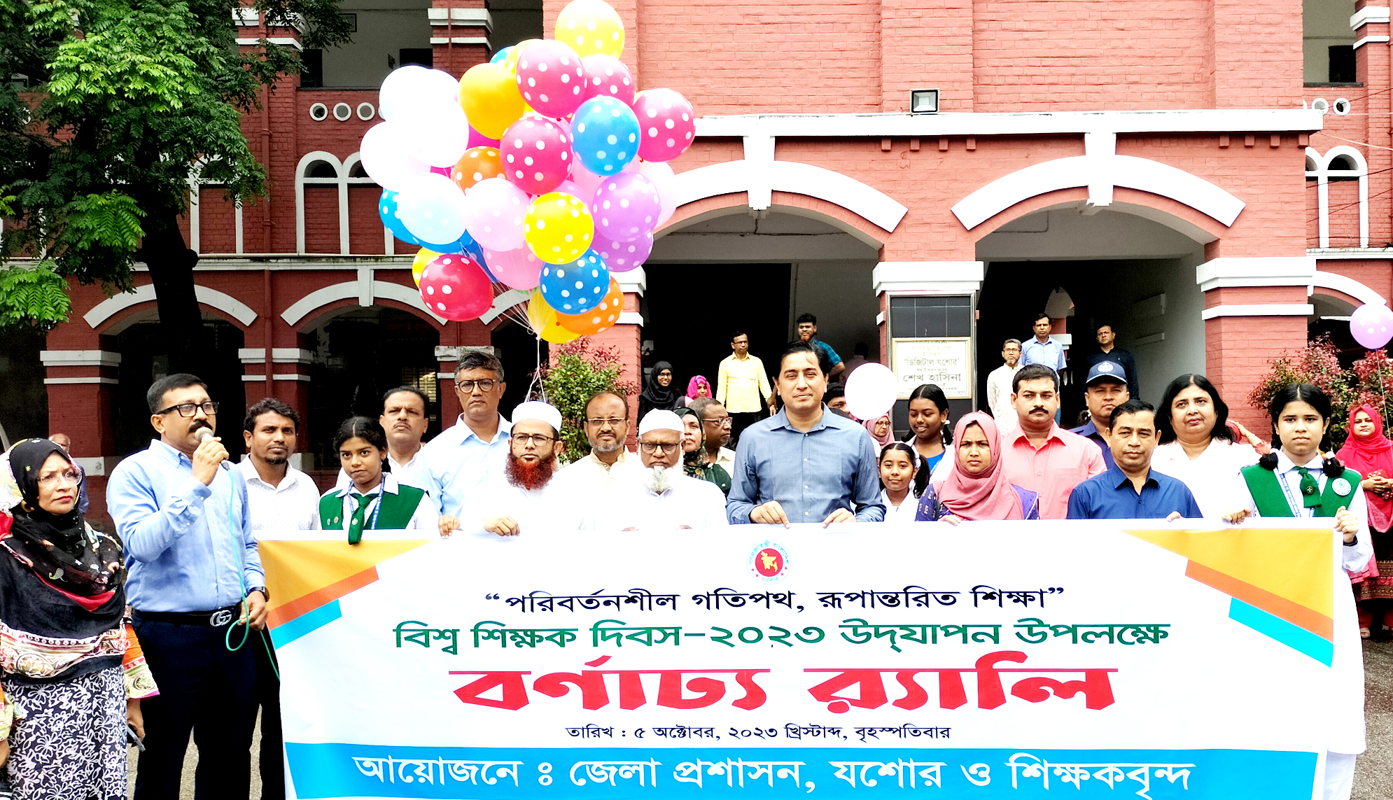 স্টাফ রিপোর্টার, যশোর : বিশ্ব শিক্ষাক দিবস উপলক্ষে যশোরে আনন্দ শোভাযাত্রা অনুষ্ঠিত হয়েছে। আজ সকাল সাড়ে নয়টায় জেলা প্রশাসকের উদ্যোগে কালেক্টরেট চত্বর থেকে এ শোভাযাত্রাটি বের করা হয়। শোভাযাত্রা শুভ উদ্বোধন করেন যশোরের নবাগত জেলা প্রশাসক আবরাউল হাসান মজুমদার।শোভাযাত্রাটি শহরের গুরুত্বপূর্ণ সড়ক প্রদক্ষিণ করে জেলা প্রশাসক কার্যালয়ে এসে শেষ হয়। শোভাযাত্রায় যশোর শহরের চারটি স্কুলের দুই শতাধিক শিক্ষক শিক্ষার্থী অংশগ্রহণ করেন। শোভাযাত্রা অন্যান্যদের মধ্যে উপস্থিত ছিলেন অতিরিক্ত জেলা প্রশাসক (শিক্ষা ও আইসিটি) মোছা: খালেদা খাতুন রেখা, জেলা শিক্ষা অফিসার মাহফুজুল হোসেন সহ প্রমূখ
