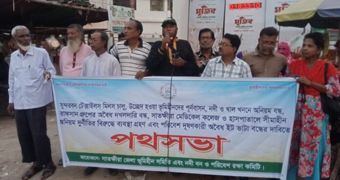 বুধবার বিকালে সাতক্ষীরা পানি উন্নয়ন বোর্ডের সামনে অনুষ্ঠিত পথসভায় সভাপতিত্ব করেন, জেলা ভূমিহীন সমিতির সভাপতি মো: কওছার আলী। বক্তব্য রাখেন, জেলা নদী বন ও পরিবেশ রক্ষা কমিটির সভাপতি কমরেড আদিত্য মল্লিক, সাধারণ সম্পাদক মফিজুর রহমান, সহ-সভাপতি সাবেক সিবি নেতা শওকত আলী, জেলা ন্যাপের সভাপতি হায়দার আলী, আইন সহায়তা কেন্দ্র আসক ফাউন্ডেশন সাতক্ষীরা জেলা কমিটির সাংগঠনিক সম্পাদক সেলিম হোসেন, জেলা ভুমিহীন সমিতির সাংগঠনিক সম্পাদক জি এম রেজাউল করিম, প্রচার সম্পাদক শেখ রিয়াজুল ইসলাম, শেখ হাফিজুর রহমান। সমগ্র অনুষ্ঠান পরিচালনা করেন, জেলা ভূমিহীন সমিতির সাধারণ সম্পাদক আব্দুস সামাদ ।    বক্তারা বলেন, বেতনা মরিচ্চাপ নদী খনন অনিয়ম বন্ধ নদীর দুই পাশের্^ দখল জমি উদ্ধার বেতনা নদীর বুকে রাফসান গ্রুপের ভবন নির্মান অব্যাহত রেখেছে। অথচ উক্ত রাফসানের অবৈধ দখলের বিরুদ্ধে একাধিকবার বিভিন্ন দপ্তরে অভিযোগ করা হলেও তার কাজ বন্ধ নেই। কার প্রভাবে নিয়ে এ অবৈধ দখল কার্যক্রম করে যাচ্ছেন সেটি সাতক্ষীরাবাসী জানতে চায়। তার খুটির জোর কোথায়? বক্তারা আরো বলেন , জননেত্রী শেখ সারাদেশ সহ সাতক্ষীরায় উন্নয়নের চিত্র পাল্টে দিচ্ছে। তাই অবিলম্বে সাতক্ষীরার