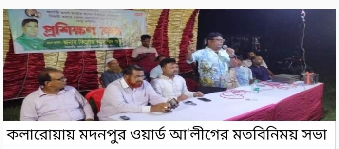 এম,এ সাজেদ, কলারোয়া ( সাতক্ষীরা) প্রতিনিধি: কলারোয়ায় চন্দনপুর ইউনিয়ন ৯ নং ওয়ার্ড আওয়ামীলীগের আয়োজনে ভোট কেন্দ্র ভিত্তিক কমিটি গঠনে এক মতবিনিময় সভা অনুষ্ঠিত হয়েছে। শনিবার(১৪ অক্টোবর) বিকালে মদনপুর বাজার মোড়ে সভাটি অনুষ্ঠিত হয়। সভায় প্রধান অতিথি হিসাবে বক্তব্য রাখেন উপজেলা আ’লীগের সভাপতি ও সাবেক উপজেলা পরিষদ চেয়ারম্যান, আগামী দ্বাদশ সংসদ নির্বাচনে নৌকা প্রতীক প্রত্যাশি ফিরোজ আহম্মেদ স্বপন। তিনি আগামী দ্বাদশ সংসদ নির্বাচনে ওয়ার্ড ভিত্তিক সকল দলীয় নেতা- কর্মীদের একত্রিত থেকে নির্বাচনী নির্দেশনা মেনে ভোট কেন্দ্রকে সুরক্ষিত রেখে ভোটারদের ভোটদানে সার্বিক সহযোগীতা ও ভোটারদের মাঝে সরকারের বিভিন্ন উন্নয়নের কথা তুলে ধরার আহবান জানান। এ ছাড়া, বিরোধী দল বি,এন,পি ও জামায়াতের নৈরাজ্য ও বিশৃঙ্খলার প্রতিবাদ জানিয়ে দলীয় কর্মীদের শান্তি বজায় রাখতে ঐক্যবদ্ধ থেকে আগামী দ্বাদশ সংসদ নির্বাচনে নৌকা প্রতীককে বিজয়ী করে দেশ নেত্রী গনতন্ত্রের মানসকন্যা জননেত্রী শেখ হাসিনার হাতকে শক্তিশালী করতে নির্বাচনী কার্যক্রম পরিচালনার উপর গুরুত্ব আরোপ করেন। সভায় ৯ নং মদনপুর ওয়ার্ড আ’লীগ সভাপতি ভুট্টোর সভাপতিত্বে অতিথি হিসাবে বক্তব্য রাখেন উপজেলা আ’লীগের সাংগঠনিক সম্পাদক ইউপি চেয়ারম্যান বেনজির হোসেন হেলাল,আ’লীগ নেতা সাবেক অধ্যক্ষ গাজী রবিউল ইসলাম, আ’লীগ নেতা সরদার আব্দুর রউফ, মাস্টার হাফিজুর রহমান, ফজলুর রহমান, ওসমান গনি সহ ওয়ার্ড  আ’লীগের নেতৃবৃন্দ। সভায় ৯ নং ওয়ার্ডের মদনপুর এলাকার অসংখ্য আ’লীগ নেতা- কর্মী প্রশিক্ষণের অংশ হিসাবে মতবিনিময় সভায় অংশগ্রহন করেন বলে জানা যায়।