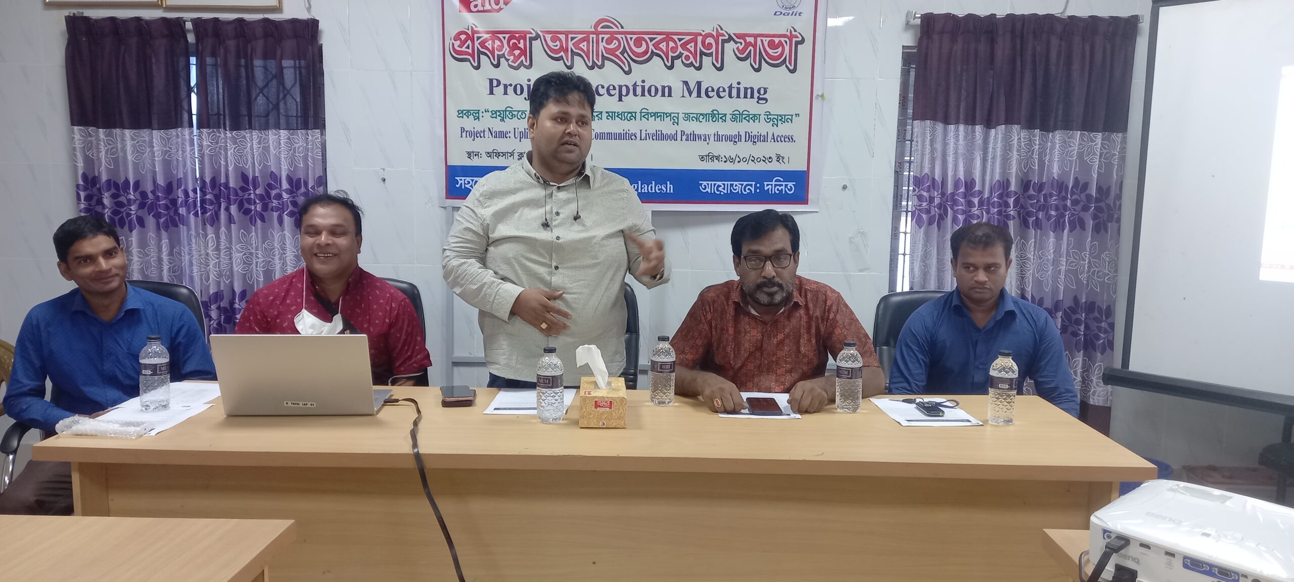 প্রধান অতিথি ছিলেন উপজেলা পরিষদ চেয়ারম্যান গাজী এজাজ আহম্মেদ। বিশেষ অতিথি ছিলেন উপজেলা ভাইস চেয়ারম্যান গাজী আব্দুল হালিম , যুব উন্নয়ন কর্মকর্তা মোঃ কামরুজ্জামান , সমাজ সেবা কর্মকর্তা সুব্রত বিশ্বাস , মহিলা বিষয়ক কর্মকর্তা রিনা মজুমদার । প্রকল্পের প্রেজেনটেশন উপস্থাপন করেন দলিতের কর্মসূচী প্রধান বিকাশ কুমার দাস। বক্তব্য রাখেন সোসাল মোবিলাইজার উজ্জ্বল দাস , কম্পিউটার প্রশিক্ষক বাঁধন কুমার পাল , টেকনিক্যাল সাপোর্ট অফিসার আঞ্জুমানারা আঁখি প্রমুখ। সভার মূল প্রতিপাদ্য বিষয় ছিল “প্রযুক্তিতে অভিগম্যতা বৃদ্ধির মাধ্যমে বিপদাপন্ন জনগোষ্ঠীর জীবিকা উন্নয়ন”।