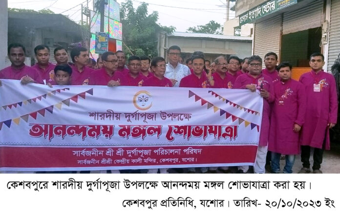কেশবপুর ব্যুরো: কেশবপুরে শারদীয় দুর্গাপূজা উপলক্ষে মঙ্গল শোভাযাত্রা করা হয়েছে। শুক্রবার বিকেলে কেশবপুর সার্বজনীন কেন্দ্রীয় কালী মন্দিরের দুর্গাপূজা পরিচালনা পরিষদের উদ্যোগে শহরে ওই শোভাযাত্রা বের করা হয়। শোভাযাত্রাটি কেন্দ্রীয় কালী মন্দির থেকে বের হয়ে শহরের প্রধান প্রধান সড়ক প্রদক্ষিণ করে।