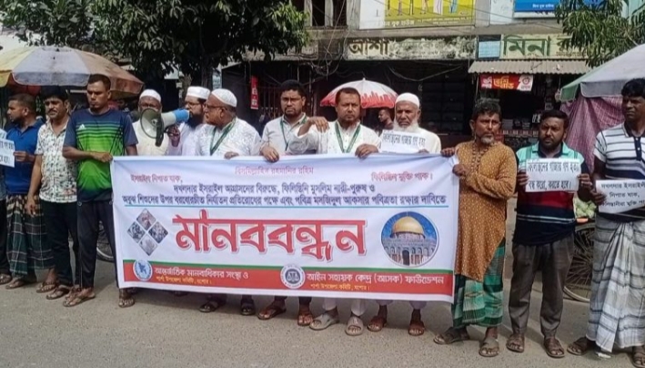 বেনাপোল থেকে এনামুলহকঃ- “ইসরাইল নিপাত যাক,ফিলিস্তিন মুক্তিপাক”। দখলদার ইসরাইল আগ্রাসনের বিরুদ্ধে,ফিলিস্তিনি মুসলিম নারী-পুরুষ ও অবুঝ শিশুদের উপর বর্বরোচিত নির্যাতন প্রতিরোধের পক্ষে এবং পবিত্র মসজিদুল আকসার পবিত্রতা রক্ষার দাবিতে বেনাপোল বাজার এলাকায় ” মানববন্ধন” করেছে আন্তর্জাতিক মানবাধিকার সংস্থা “আইন সহায়ক কেন্দ্র(আসক) ফাউন্ডেশন,শার্শা উপজেলা কমিটি।