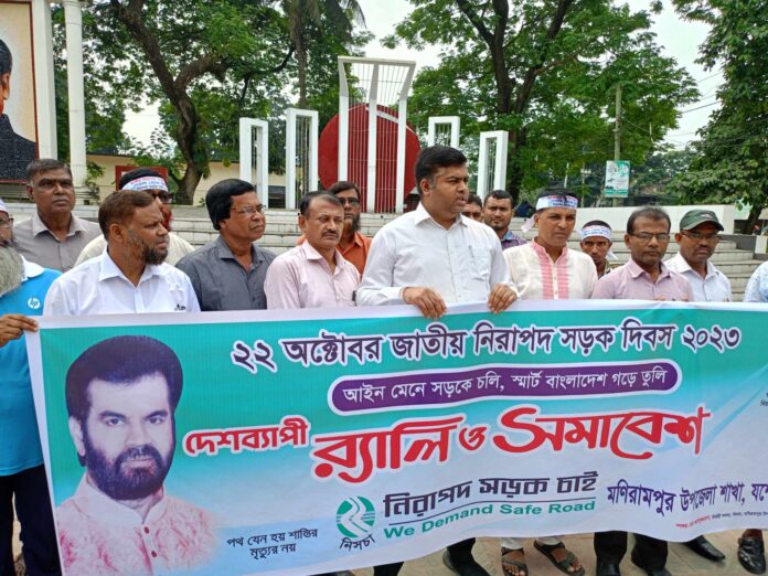 মাবিয়া রহমান,মনিরামপুর(যশোর)প্রতিনিধিঃ “নিরাপদ সড়ক চাই” সংগঠনের মনিরামপুর শাখার উদ্যোগে জাতীয় নিরাপদ সড়ক দিবস উদযাপন উপলক্ষে এক বর্ণিল আয়োজনে দিনব্যাপী নানান কর্মসূচি হাতে নিয়েছে সংগঠনটি। ২২শে অক্টোবর রবিবার উপজেলার কেন্দ্রীয় শহীদ মিনারে শপথবাক্য পাঠের মধ্য দিয়ে দিনব্যাপী অনুষ্ঠানের শুভ সূচনা ঘোষণা করা হয়।