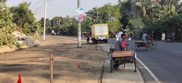 ডুমুরিয়ায় দূর্ঘটনা এড়াতে বাঁক সোজা করার রাস্তায় বিদ্যুতের খুঁটি রেখে পিচ ঢালাই।