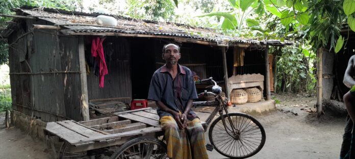 স্টাফ রিপোর্টার কালীগঞ্জ,(ঝিনাইদহ) : পঞ্চাশোর্ধ উজ্জ্বল দাস ঝিনাইদহের কালীগঞ্জ উপজেলার ৩ নং কোলা ইউনিয়নের কামালহাট গ্রামের মৃত রনজিত কুমার দাস ও কমেলা রানী দাসের ছেলে। বৃদ্ধা মা, স্ত্রী, এক ছেলে ও এক মেয়েকে নিয়ে তার অভাবের সংসার। মাত্র ২ শতাংশ জমির উপর টিনের  ছাপড়ার দুটি ঘর তার মাথা গোজার একমাত্র ঠাই। উজ্জ্বল দাস ৫ জনের সংসার চালাতে প্রথমদিকে অন্যের জমিতে কামলা হিসেবে কাজ করতেন। এরপর তিনি শুরু করেন পায়ে চালিত ভ্যান চালানো। দিন দিন শরীরে শক্তি সামর্থ্য কমতে থাকায় পায়ে চালিত ভ্যান গাড়ির পরিবর্তে অনেক কষ্টে ধার দেনা করে তিনি পুরাতন বডির একটি ভ্যান গাড়িতে চারটি ব্যাটারি সংযোজন করে ওই ব্যাটারি চালিত ভ্যান চালিয়ে কোনমতে দুবেলা দুমুঠো খেয়ে পরে দিন কাটাচ্ছিলেন। কিন্তু বিধিবাম! চোরের কুদৃষ্টি পড়ল অসহায় নিঃস্ব উজ্জ্বল দাসের জীবন জীবিকার একমাত্র অবলম্বন ব্যাটারি চালিত সেই ভ্যান গাড়িটির দিকে। সপ্তাহ তিনেক আগে গভীর রাতে চোরচক্রের সদস্যরা উজ্জ্বল দাস এর বাড়ির উঠান থেকে ভ্যান গাড়িটি চুরি করে মাঠের মধ্যে নিয়ে তা থেকে  ব্যাটারিগুলো খুলে নিয়ে যায়। আর ফেলে রেখে যায় পুরাতন বডির ভ্যান গাড়িটি।পরের দিন সকালে ভ্যান গাড়িটি বাড়িতে না দেখে কান্নায় ভেঙে পড়েন তিনি। পরবর্তীতে খোঁজাখুঁজির এক পর্যায়ে মাঠের মধ্যে ব্যাটারীবিহীন ভ্যানটি তিনি খুঁজে পান। ব্যাটারী না থাকায় ভ্যানটি এখন অকেজো হয়ে পড়ে রয়েছে তার বাড়িতে। যে কারণে ওই ভ্যান দিয়ে তিনি আর উপার্জন করতে পারছেন না। আগে ভ্যান চালিয়ে প্রতিদিন ৩ শত  থেকে ৫ শত টাকা আয় হলেও এখন উজ্জল দাসের আয়ের পথ সম্পূর্ণ বন্ধ। এতটাই অভাবী উজ্জ্বল দাস যে, তার গায়ে দেওয়ার মতো একটি ভালো জামাও নেই, এমনকি পায়ে দেয়ার মত নেই এক জোড়া জুতা। ব্যাটারি চুরি হওয়ার পর কেমন যেনো হয়ে গেছেন উজ্জল দাস। অপলক দৃষ্টিতে তাকিয়ে থাকেন, সংসার চালানোর চিন্তা তার চোখে মুখে সুস্পষ্টভাবে ফুটে উঠেছে। ১০ টাকা কেজি চাউলের একটি কার্ড ছাড়া আর কোন সরকারি সাহায্য সহযোগিতা তিনি পান না। অবশ্য উজ্জ্বল দাস অন্যের সহযোগিতায় জীবন চালাতে চান না। নিজের পরিশ্রমের টাকায় সংসার চালাতেই তিনি পছন্দ করেন।  বর্তমানে তার আয় রোজগার না থাকায় ইতিমধ্যে কলেজ পড়ুয়া একমাত্র মেয়ের লেখাপড়া বন্ধ হয়েছে। একমাত্র ছেলে অন্যের দোকানে থেকে যা আয় করে তাও সংসার খরচের জন্য অতি সামান্য। যে কারণে উজ্জল দাসের পরিবারের সদস্যরা  এখন দিন কাটাচ্ছেন অর্ধহারে অনাহারে।