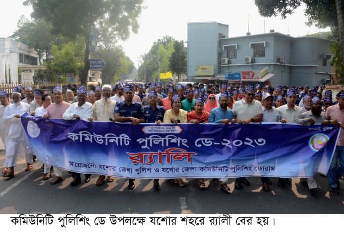 স্টাফ রিপোর্টার : গতকাল শনিবার সকালে যশোর জেলা পুলিশ ও যশোর জেলা কমিউনিটি পুলিশিং ফোরামের আয়োজনে অতিরিক্ত পুলিশ সুপার বেলাল হোসাইন এর নেতৃত্বে ‘কমিউনিটি পুলিশিং ডে-২০২৩ উদযাপন উপলক্ষ্যে’ এক বর্ণাঢ্য র্যালি যশোর জেলা পুলিশ সুপারের কার্যলয়ের সামনে থেকে শুরু হয়ে চুয়াডাঙ্গা বাসস্ট্যান্ড, শহীদ মশিউর রহমান সড়ক হয়ে জেলা পুলিশ লাইনে এসে শান্তিপূর্ণভাবে শেষ হয়। উপস্থিত ছিলেন যশোর ডিএসবির অতিরিক্ত পুলিশ সুপার মোঃ ফিরোজ কবির, ক সার্কেলের অতিরিক্ত পুলিশ সুপার জুয়েল ইমরান, মনিরামপুর উপজেলা আওয়ামী লীগের সভাপতি ও পৌর মেয়র অধ ্যক্ষ কাজী মাহমুদুল হাসান, বাঘারপাড়া পৌর মেয়ের কামরুজ্জামান বাচ্চু, জেলা মুক্তিযোদ্ধা বিষয়ক সম্পাদক হারুনুর রশীদ, জেলা যুব মহিলা লীগের সভাপতি মুঞ্জুন্নাহার নাজনীন সোনালী, যশোর এম এম কলেজের অধ্যক্ষ মর্জিনা বেগম প্রমূখ।