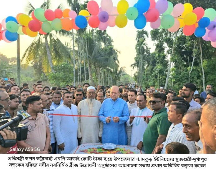 হেলাল উদ্দিন, রাজগঞ্জ : পল্লী উন্নয়ন ও সমবায় প্রতিমন্ত্রী বীরমুক্তিযোদ্ধা স্বপন ভট্টাচার্য্য এমপি বলেছেন, নাগরিক সেবায় রাস্তা-ঘাট, ব্রীজ, শিক্ষাপ্রতিষ্ঠানের ভবন ও বিভিন্ন প্রকল্পের কার্যক্রম দৃশ্য মান উন্নয়ন করা হয়েছে। এখন জননেত্রী শেখ হাসিনার নেতৃত্বে বাংলাদেশ উন্নয়নশীল দেশের মর্যাদা অর্জন করেছে। আর্থ-সামাজিক উন্নয়নে বাংলাদেশ বিশ্বে রোল মডেল হয়েছে। ২০৪১ সালের মধ্যে স্মার্ট, উন্নত-সমৃদ্ধ দেশে পরিণত করার লক্ষ্য নিয়ে সরকার নিরলস কাজ করে যাচ্ছে। কিন্তু এ উন্নয়নকে বাধাগ্রস্থ্য করতে স্বাধীনতা বিরোধী সাম্প্রদায়িক গোষ্ঠী ও  গণতন্ত্র বিরোধী চক্র আবারও নানাভাবে ষড়যন্ত্র করে যাচ্ছে। তারা আবারও আগুন সন্ত্রাস শুরু করেছে। সবাইকে সজাগ থাকতে হবে, এ অপশক্তির অপতৎপরতা ও ষড়যন্ত্রের বিরুদ্ধে। তাদেরকে ঐক্যবদ্ধভাবে মোকাবিলা করে দেশের উন্নয়নের ধারাবাহিকতা বজায় রাখতে আবারও জননেত্রী শেখ হাসিনার নৌকায় ভোট দিতে আহবান জানান।  প্রতিমন্ত্রী বুধবার বিকালে আড়াই কোটি টাকা ব্যয়ে মনিরামপুর উপজেলার শ্যামকুড় ইউনিয়নের মুজগুন্নী-দূর্গাপুর সড়কের হরিহর নদীর নবনির্মিত ব্রীজ, প্রায় ৩ কোটি টাকা ব্যয়ে দূর্বাডাঙ্গা ইউনিয়নের বিপ্রকোনা দাখিল মাদ্রাসার নবনির্মিত চারতলা ভবন ও প্রায় ১ কোটি টাকা ব্যয়ে বিপ্রকোনা টু নারকেলবাড়িয়া সড়কের উদ্বোধনী অনুষ্ঠানের পর আলোচনা সভায় প্রধান অতিথির বক্তৃতায় এসব কথা বলেন। অনুষ্ঠানে বিশেষ অতিথি বক্তৃতা করেন উপজেলা আওয়ামীলীগের সভাপতি পৌর মেয়র অধ্যক্ষ কাজী মাহমুদুল হাসান। অনুষ্ঠানে সভাপতিত্ব করেন শ্যামকুড় ইউনিয়ন আওয়ামী লীগের সভাপতি শাহিনুর রহমান শাহিন ও দূর্বাডাঙ্গা ইউনিয়ন আওয়ামী লীগের সভাপতি সুবোধ কুমার সরকার। সাবেক ছাত্রলীগ নেতা ইউপি সদস্য আব্দুল হালিম বিশ্বাস ও উপজেলা কৃষকলীগের যুগ্ম সম্পাদক শামিম আক্তারের পরিচালনায় আলোচনা সভায় আরও  বক্তব্য রাখেন উপজেলা আওয়ামী লীগের নেতা অ্যাডভোকেট বশির আহম্মেদ খান, উপজেলা পরিষদের ভাইস চেয়ারম্যান যুবলীগের আহবায়ক উত্তম চক্রবর্তী বাচ্চু, শ্যামকুড় ইউনিয়ন পরিষদের চেয়ারম্যান আলমগীর হোসেন, ইউনিয়ন আওয়ামী লীগের বারবার নির্বাচিত সাধারণ সম্পাদক সাবেক চেয়ারম্যান মনিরুজ্জামান মনি, উপজেলা কৃষকলীগের সাধারণ সম্পাদক নজরুল ইসলাম সরদার, উপজেলা আওয়ামী লীগের সাবেক শ্রম বিষয় সম্পাদক অজিত কুমার ঘোষ, অধ্যক্ষ চঞ্চল ভট্টাচার্য্য, আওয়ামী লীগ নেতা রমেশ কুমার দাস, মুক্তিযোদ্ধা হেরমত আলী, মুজিবুর রহমান সহ প্রমুখ।