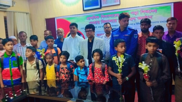 সাইফুল ইসলাম :শালিখা (মাগুরা) প্রতিনিধি: মাগুরার শালিখায় দক্ষিণ সাবলাট, কুষখালী, চতুরবাড়িয়া, উজগ্রাম,পাথরঘাটাসহ উপজেলার ১২ টি সরকারি প্রাথমিক বিদ্যালয় থেকে ঝরে পড়া ১২ জন শিক্ষার্থীকে বই,খাতা,স্কুল ব্যাগ, জুতা, স্কুল ড্রেস, আর্থিক প্রাণোদনাসহ বিভিন্ন শিক্ষা উপকরণ প্রদান পূর্বক নতুন করে ভর্তি করে লেখাপড়ার সুযোগ করে দিয়েছেন মাগুরা জেলা প্রশাসক মোহাম্মদ আবু নাসের বেগ।১৫ নভেম্বর (বুধবার) বিকালে শালিখা উপজেলা প্রশাসন সভাকক্ষে এ উপলক্ষে আয়োজিত এক অনুষ্ঠানে প্রধান অতিথি হিসেবে উপস্থিত থেকে শিক্ষার্থীদের ভর্তি কার্যক্রম সম্পন্ন করেন তিনি। এসময় তিনি বলেন,ঝরে পড়া শিশুরা সমাজের বোঝা নয় তারাই হতে পারে ভবিষ্যতের নেতৃত্ব স্থানীয় ব্যক্তি ইতিহাস তেমনটি বলে। তাই আপনাদের সন্তানদেরকে স্কুলে পাঠান দেশ ও দশের কল্যাণে নিবেদিত হওয়ার সুযোগ করে দিন। মনে রাখবেন শিক্ষা মানুষকে অন্ধকার থেকে আলোর পথে নিয়ে আসে। তিনি আরো বলেন, একটি শিশু ঝরে পড়ার ক্ষেত্রে শিশুরা দায়ী নয়, দায়ী আমরা, দায়ী শিক্ষক, দায়ী সংশ্লিষ্ট ব্যক্তিবর্গ। তাই আমাদের সকলকেই দায়বদ্ধতার জায়গা থেকে সচেতন হতে হবে। উপজেলা প্রশাসনের আয়োজনে অনুষ্ঠিত এ ভর্তি অনুষ্ঠানে উপজেলা নির্বাহী কর্মকর্তা হরেকৃষ্ণ অধিকারীর সভাপতিত্বে বিশেষ অতিথি ছিলেন শালিখা উপজেলা পরিষদের চেয়ারম্যান এ্যাড: কামাল হোসেন, মাগুরা জেলা শিক্ষা কর্মকর্তা আশরাফুল আলম, শালিখা থানা অফিসার ইনচার্জ (ওসি) মোশাররফ হোসেন। এছাড়াও উপজেলা মুক্তিযোদ্ধা কমান্ডার আবু বক্কর, বীর মুক্তিযোদ্ধা সর্দার ফারুক হোসেন,  উপজেলার বিভিন্ন দপ্তরের কর্মকর্তাবৃন্দ বিভিন্ন শিক্ষা প্রতিষ্ঠানের প্রধান শিক্ষকগণসহ ঝরে পড়া শিক্ষার্থীদের অভিভাবকসহ প্রমূখ উপস্থিত ছিলেন।  জেলা প্রশাসকের প্রচেষ্টায় নতুন করে লেখাপড়ার সুযোগ পেয়ে সীমাহীন আনন্দ প্রকাশ করেছেন সদ্য ভর্তি হওয়া শিক্ষার্থীরা পাশাপাশি ছেলেমেয়েদের নতুন করে স্কুলে পড়ালেখার সুযোগ করে দেওয়ায় জেলা প্রশাসককে ধন্যবাদ জ্ঞাপন করেছেন ঝরে পড়া শিক্ষার্থীদের অভিভাবকবৃন্দ