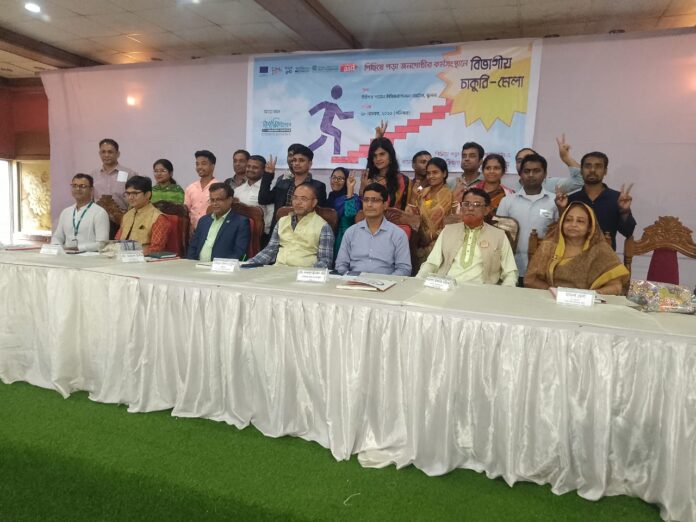স্টাফ রিপোর্টার : পিছিয়ে পড়া জনগোষ্ঠীর কর্মসংস্থানে বিভাগীয় চাকুরি মেলা অনুষ্ঠিত হয়েছে। গতকাল শনিবার (১৮ নভেম্বের) বেলা ১১ টায় খুলনা টাইগার গার্ডেন ইন্টারন্যাশল হোটেলে নাগরিক উদ্যোগের আয়োজনে এল এন ও বি কোয়ালিশন ইএলএমসি প্রকল্পের খুলনা বিভাগের সভাপতি নজরুল ইসলাম মল্লিকের সভাপতিত্বে দ্বিতীয় পর্বে প্রধান অতিথির বক্তব্যে রাখেন অতিরিক্ত জেলা প্রশাসক মো.নাজমুল হুসাইন খান, উদ্বোধক হিসেবে প্রথম পর্বে প্রধান অতিথির বক্তব্য রাখেন খুলনা প্রেসক্লাবের সভাপতি এস এম নজরুল ইসলাম। বিশেষ অতিথির বক্তব্যে রাখেন খুলনা জেলা সমাজ সেবার উপপরিচালক খান মোতাহার হোসেন, সুশীলনের প্রধান নির্বাহী মোস্তফা নুরুজ্জামান, ক্রিশ্চিয়ান এইডের প্রজেক্ট ম্যানেজার মাহেনুর আলম চৌধুরী, জবঘর ২৪.কম এর প্রধান নির্বাহী অদ্রিস দিপংকর, ক্রিশ্চিয়ান এইডের প্রোগ্রাম ম্যানেজার আনজুম নাহিদ চৌধুরী, নাগরিক উদ্যোগ প্রকল্প সমন্ময়কারী মো. আব্দুল্লাহ আল ইসতিয়াক মাহমুদ। শুভেচ্ছা বক্তব্য রাখেন খুলনা যুব উন্নয়ন অধিদপ্তরের উপপরিচালক মো.মোস্তাক উদ্দিন, মহিলা বিষয়ক অধিদপ্তরের উপপরিচালক হাসনা হেনা,খুলনা চেম্বার অব কমার্সের পরিচালক মফিদুল ইসলাম টুটুল। অন্যান্যের মধ্যে উপস্থিত ছিলেন এল এন ও বি কোয়ালিশন ইএলএমসি প্রকল্পের খুলনা বিভাগের সহ সভাপতি মারিয়া ভূঁইয়া মেরী,সদস্য সালমা জাহান,শুভব্রত কুমার মিস্ত্রি, পাখি দত্ত, ইসরাত আরা হীরা।আমন্ত্রিত অতিথি হিসেবে উপস্থিত ছিলেন ফুলতলা প্রতিদিন পত্রিকার সম্পাদক ও প্রকাশক সুমন সরদার, নওয়াপাড়া প্রেসক্লাবের দফতর সম্পাদক শাহীন আহমেদ, এসময় পিছিয়ে পড়া জনগোষ্ঠীর ক্ষমতায়ন ও বাংলাদেশ উন্নয়ন প্রক্রিয়ায় সক্রিয় অংশ গ্রহণ প্রকল্পের আওতায় পিছিয়ে পড়া জনগোষ্ঠীর কর্মসংস্থান চাকুরি মেলায় ১৪টি স্টল অংশ গ্রহণ করে। অনুষ্ঠান সঞ্চালনা করেন খুলনা প্রেসক্লাবের যুগ্ন সম্পাদক মাহবুবুর রহমান মুন্না ও বাংলাদেশ বেতার খুলনার উপস্থাপিকা ফাহমিদা নাহিন ঐন্দ্রিলা। এ চাকুরি মেলায় স্থানীয় ও জাতীয় পযার্য়ের ১৩ ব্যবসায়িক প্রতিষ্ঠানে পিছিয়ে পড়া জনগোষ্ঠীর ১০৪ জন চাকুরি প্রার্থীরা অংশ গ্রহণ করেন। বক্তারা বলেন, বাংলাদেশে মোট জনসংখ্যার ১১ % পিছিয়ে পড়া জনগোষ্ঠী আছে। এই জনগোষ্ঠীর একটি উল্লেখ যোগ্য অংশ হলো দলিত, ক্ষৃদ্র নৃ গোষ্ঠী হিজড়া ও ট্রান্সজেন্ডার জনগোষ্ঠী এবং প্রতিবন্ধী ব্যক্তি। যে কারনে এই আয়োজন। এছাড়াও রাজশাহী বিভাগে ও সিলেট বিভাগে এই চাকুরি মেলা আয়োজন করা হবে । এই অনুষ্ঠানে সার্বিক সহযোগীতায় ছিলেন পিছিয়ে পড়া জনগোষ্ঠীর ক্ষমতায়ন ও বাংলাদেশ উন্নয়ন প্রক্রিয়ায় সক্রিয় অংশ গ্রহণ প্রকল্প ইউরোপিয়ান ইউনিয়ন, বন্ধু