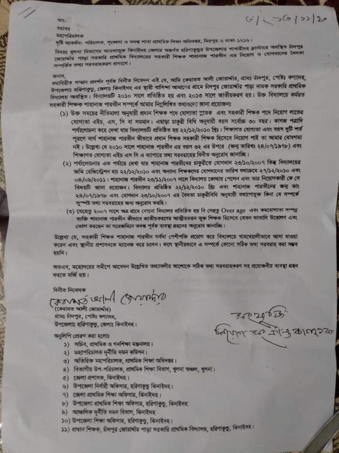 কামরুজ্জামান লিটন ঝিনাইদহ : স্কুলের অস্তিত্ব নেই, অথচ নিয়োগ হয়েছে প্রধান শিক্ষক। এমন এক অবিশ্বাস্য ভৌতিক ও জালিয়াতিপুর্ন নিয়োগ নিয়ে তোলপাড় সৃষ্টি হয়েছে হরিণাকুন্ডু উপজেলায়। এ নিয়ে সর্বত্র চলছে আলোচনা সমালোচনার ঝড়। স্কুলই প্রতিষ্ঠা হয়নি অথচ অস্তিত্ববিহীন প্রতিষ্ঠানের নিয়োগ নিয়ে দিব্যি চাকরী করে যাচ্ছেন শাহনাজ পারভীন শেফালী নামে এক শিক্ষক। তিনি হরিণাকুন্ডু উপজেলার চাঁদপুর পশ্চিমপাড়ার আসমত বিশ্বাসের মেয়ে। দূর্নীতি দমন কমিশনের মহাপরিচালক বরাবর পাঠানো এক লিখিত অভিযোগ সুত্রে জানা গেছে, ঝিনাইদহের হরিণাকুন্ডু উপজেলার চাঁদপুর জোয়ারদার পাড়ায় ২০১০ সালের ২২ ডিসেম্বর একটি বেসরকারী প্রাথমিক বিদ্যালয় প্রতিষ্ঠা হয়। তিন বছর পর ২০১৩ সালে স্কুলটি জাতীয়করণ করা হয়। অথচ স্কুল প্রতিষ্ঠার তিন বছর আগে ২০০৭ সালে একটি জালিয়াতিপুর্ন নিয়োগ নিয়ে চাকরী করে যাচ্ছেন শাহনাজ পারভীন শেফালী। নিয়মিত তিনি স্কুলের ক্লাস নিচ্ছেন, কোন বাধা ছাড়াই তুলছেন সরকারী বেতন ভাতা। লিখিত অভিযোগ উল্লেখ করা হয়, ২০১০ সালে স্কুল প্রতিষ্ঠার সময় শাহনাজ পারভীন শেফালীর বয়স ছিল ৩২ বছর। ফলে এ সময়ে তার চাকরী হওয়ার কথা নয়। তার জন্ম তারিখ ২৪/০৭/১৯৭৮। অভিযোগে বলা হয়েছে, বয়স জালিয়াতি করার জন্যই শাহনাজ পারভীন শেফালী স্কুল প্রতিষ্ঠার তিন বছরের আগের ভুয়া নিয়োগ ও রেজুলেশন দেখাচ্ছেন। স্কুলের প্রধান শিক্ষক মোস্তাফিজুর রহমান মুকুল জানান, স্কুলের জমি রেজিষ্ট্রি হয় ২০১০ সালের ২২ ডিসেম্বর। ওই তারিখেই স্কুলটি প্রতিষ্ঠা দেখানো হয়। স্কুলের শিক্ষকদের যোগদানের তারিখ যথাক্রমে ২০১০ সালের ২৭ ডিসেম্বর ও ২০১১ সালের ৪ সেপ্টম্বর। ফলে ২০০৭ সালের নিয়োগ সম্পুর্ন অগ্রহনযোগ্য। স্কুলটির তৎকালীন সভাপতি দেখানো হয়েছে নুরো। কিন্তু ওই গ্রামে নুরুল ইসলাম জর্দ্দার নামে এক ব্যক্তি আছেন। তিনি জানান, ২০০৭ সালে চাঁদপুর জোয়ারদার পাড়ায় সরকারী বা বেসরকারী স্কুলের কোন অস্তিত্ব ছিল না। তাছাড়া শিক্ষক নিয়োগ তো দুরের কথা, আমি কোনদিন স্কুলের সভাপতি ছিলাম না। তিনি আরো জানান, ২০১০ সালে স্কুলটি প্রতিষ্ঠা করার পর ফজলুর রহমান মালিতাকে সভাপতি করা হয় এবং তিনিই শিক্ষক নিয়োগ দেন। এ ব্যাপারে হরিণাকুন্ডু উপজেলা প্রাথমিক শিক্ষা অফিসার আব্দুর রহমান লিখিত অভিযোগের খবর নিশ্চত করে জানান, চাঁদপুর জোয়ারদার পাড়া সরকারী প্রাথমিক বিদ্যালয়ের সহকারী শিক্ষক শাহনাজ পারভীন শেফালীর বিরুদ্ধে জেলা শিক্ষা অফিসে লিখিত অভিযোগ দেওয়া হয়েছে। অভিযোগের প্রেক্ষিতে একটি তদন্ত কমিটি গঠন করা হয়েছে। তদন্ত কমিটি এ বিষয়ে তদন্ত করে কাগজপত্র বাছাই করে ব্যবস্থা গ্রহন করবেন বলেও তিনি জানান।