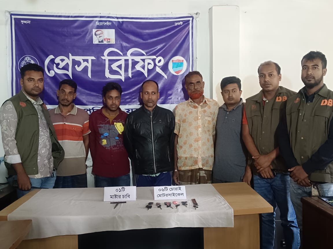 যশোর প্রতিনিধিঃ যশোরে মোটরসাইকেল চোরচক্রের পাঁচ সদস্যকে আটক করেছে জেলা গোয়েন্দা পুলিশ (ডিবি)। সোমবার (২৭ নভেম্বর) অভিযান পরিচালনা করে তাদের আটক করা হয়। এসময় ৬টি চোরাই মোটরসাইকেল ও মাষ্টার চাবি উদ্ধার করা হয়েছে। আটককৃতরা হলো, সাতক্ষীরা জেলার আল আমিন সরদার (৪২), চুয়াডাঙ্গা জেলার সাগর আহম্মেদ নিলু (২৮), শুভ (২৫), সেলিম রেজা (৩২) ও কুষ্টিয়ার আয়ুব আলী মালিথা (৫৮)। মঙ্গলবার (২৮ নভেম্বর) জেলা পুলিশ এক প্রেস বিজ্ঞপ্তিতে এ তথ্য জানিয়েছে।প্রেস বিজ্ঞপ্তিতে জানানো হয়, শহরের গাজীর দরগা এলাকায় ১ আগস্ট রাতে জাহিদুল ইসলামের বসতবাড়ি থেকে একটি নীল রংয়ের ১৫০ সিসি পালসার ডবল ডিক্স মোটরসাইকেল চুরির ঘটনাসহ যশোর শহর ও শহরতলীর বিভিন্ন এলাকার একাধিক মোটরসাইকের চুরির ঘটনায় কনস্টেবল আব্দুল বাতেন তথ্য প্রযুক্তির মাধ্যমে চোরচক্রকে শনাক্ত করলে এসআই আরিফ হোসেন ও রাজেশ দাশ সমন্বয়ে একটি চৌকশ টিম সোমবার বিকালে গোপন তথ্যের ভিত্তিতে শহরের উপশহর এলাকায় অভিযান পরিচালনা করে কুখ্যাত মোটরসাইকেল চোর আল-আমিন সরদার আলমগীরকে আটক করা হয়। এসময় চুরিকাণ্ডে ব্যবহৃত মাষ্টার চাবি ও ১টি চোরাই মোটরসাইকেল উদ্ধার করা হয়। গ্রেফতারকৃতের স্বীকারোক্তিতে চুয়াডাঙ্গা ও কুষ্টিয়া জেলায় অভিযান পরিচালনা করে চোরচক্রের আরো ৪ সদস্যকে গ্রেফতার করে তাদের হেফাজতে থাকা নীল রংয়ের পালসারসহ মোট ৫টি চোরাই মোটরসাইকেল উদ্ধার করা হয়। গ্রেফতারকৃত আসামিদেরকে আদালতে সোপর্দ করা হবে।