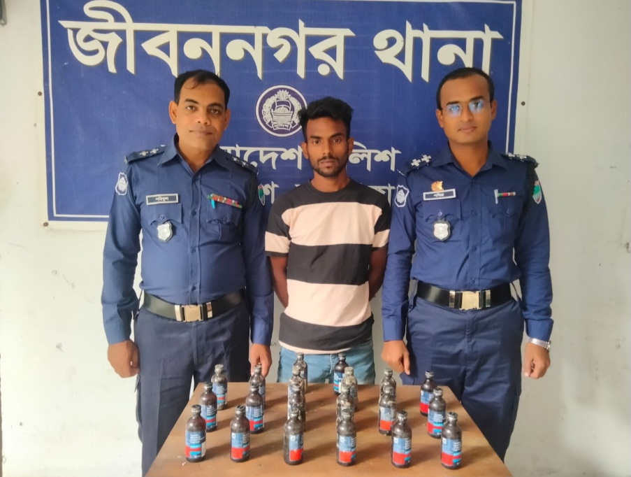 বুধবার সকাল১০ টায় জীবননগর থানার  অফিসার ইনচার্জ (ওসি) এস এম জাবীদ হাসানের নেতৃত্বে এসআই এসএম রায়হানসহ সঙ্গীয় ফোর্স  গোপন সংবাদের ভিত্তিতে ধান্যখোলা গ্রামে মাদক বিরোধী অভিযান চালান।এসময় ধান্যখোলা মাঝপাড়া হতে একই এলাকার বেনিপুর গ্রামের লাবলু হোসেনের ছেলে রাজিব(৩৫) কে আটক করে তার দেহ তল্রাসী করে।পরে তার দেহে বিশেষ কায়দায় রাখা ২১ বোতল ফেনসিডিল উদ্ধার হয়।পুলিশ জানান, গ্রেপ্তারকৃত আসামির বিরুদ্ধে জীবননগর থানায় মাদকদ্রব্য নিয়ন্ত্রণ আইনে মামলা রুজু করা হয়েছে।