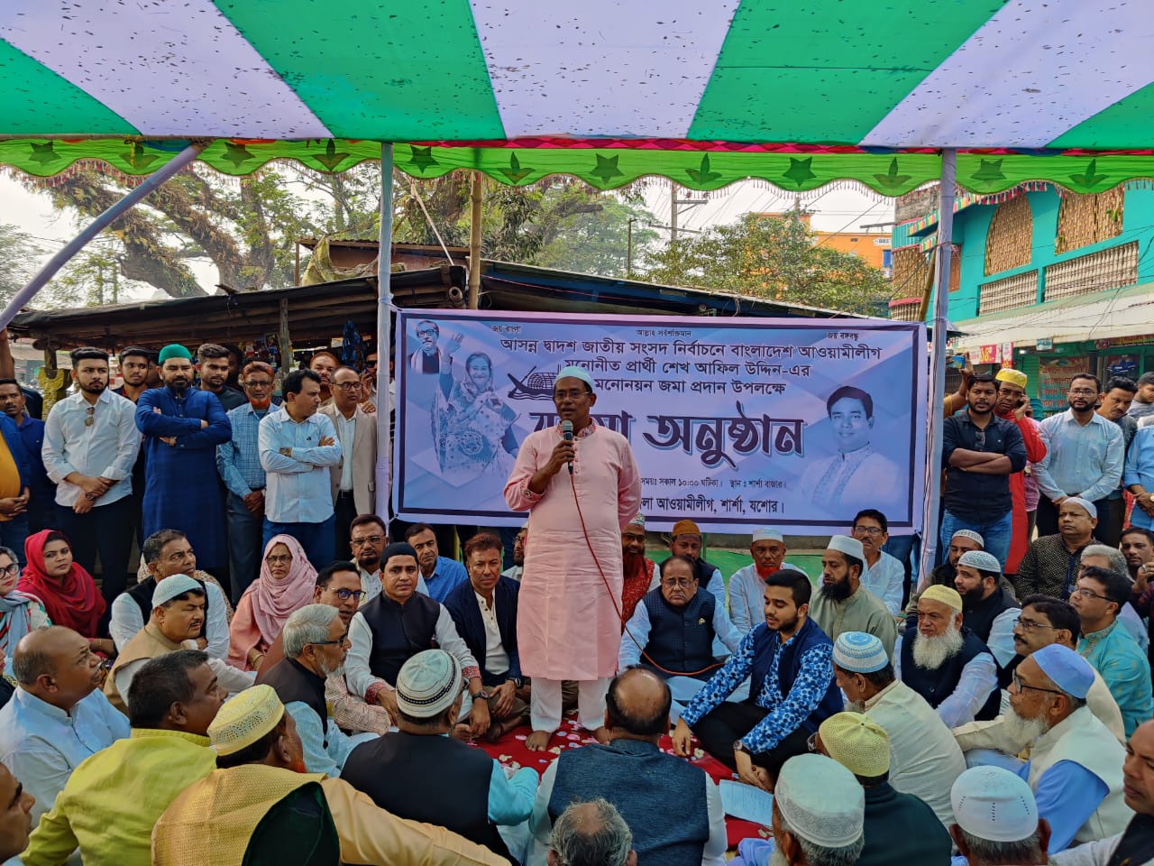 শার্শা : শার্শা উপজেলা আওয়ামী লীগের আয়োজনে আসন্ন দ্বাদশ জাতীয় সংসদ নির্বাচনে বাংলাদেশ আওয়ামী লীগ মনোনীত প্রার্থী শেখ আফিল উদ্দিন এমপি’র মনোনয়ন জমা প্রদান উপলক্ষে বুধবার দোয়া অনুষ্ঠানের আয়োজন করা হয়। এসময় নৌকার মাঝি দিকনির্দেশনামূলক বক্তব্য রাখেন