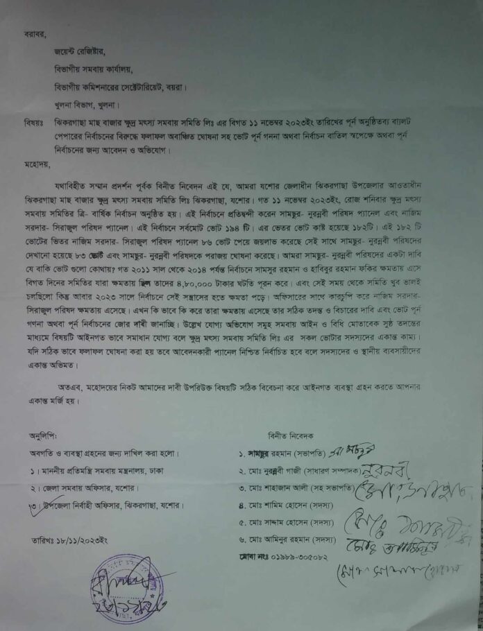 ঝিকরগাছা (যশোর) প্রতিনিধি : যশোরের  ঝিকরগাছা মাছবাজার ক্ষুদ্র সমবায় সমিতি লিমিটেডের নির্বাচনে অনিয়মের অভিযোগ তুলে পূণরায় ভোট গননার দাবি জানিয়ে জয়েন্ট রেজিষ্টার, বিভাগীয় সমবায় কার্যালয় খুলনা বরাবর লিখিত আবেদন করেছেন সামছুর রহমান-নুরন্নবী পরিষদের ৬সদস্য।  যার অনুলিপি কপি দেয়া হয়েছে মাননীয় সমবায় প্রতিমন্ত্রী, যশোর জেলা সমবায় অফিসার ও ঝিকরগাছা উপজেলা নির্বাহী অফিসার বরাবর। অভিযোগ সুত্রে জানাগেছে, গত ১১ নভেম্বর-২০২৩ ইং ঝিকরগাছা মাছবাজার সমিতির নির্বাচন অনুষ্ঠিত হয়। নির্বাচনে দুটি প্যানেল সামছুর-নুরন্নবী পরিষদ ও নাজিম সরদার-সিরাজুল পরিষদের ৬ জন করে প্রার্থী (সভাপতি একজন, সহ-সভাপতি একজন, সাধারন সম্পাদক একজনসহ ৩জন করে সদস্য প্রতিদ্ব›দ্বীতা করে। নির্বাচনে ১৯৪ জন ভোটের মধ্যে ১৮২ জন ভোটার তাদের ভোটাধিকার প্রয়োগ করেন। নির্বাচনের ফলাফলে নাজিম সরদার-সিরাজুল পরিষদকে ৮৬ ভোট ও সামছুর রহমান-নুরন্নবী পরিষদকে ৮৩ ভোট দেখানো হয়েছে। বাকি ১৩ ভোটের কোন হিসাব দেয়া হয়নি বলেও অভিযোগে উল্লেখ করা হয়েছে। সামছুর-নুরন্নবী পরিষদের সভাপতি প্রার্থী সামছুর রহমান, সাধারন সম্পাদক প্রার্থী নুরুন্নবী গাজী, সহ-সভাপতি প্রার্থী শাহাজাহান আলী, সদস্য প্রার্থী শামিম হোসেন, সাদ্দাম হোসেন ও আমিনুর রহমান জানিয়েছেন, নির্বাচনের প্রিজাইডিং অফিসার উপজেলা সমবায় অফিসার সালাউদ্দিন আহম্মেদের সাথে েেগাপন যোগসাজসে নাজিম সরদার-সিরাজুল পরিষদ নির্বাচিত হয়েছে। এছাড়া সংগঠনটি মৎস্য বিভাগের হলেও প্রিজাইডিং অফিসার কর্তৃক উক্ত নির্বাচন সংক্রান্ত কোন পত্র উপজেলা সিনিয়র মৎস্য কর্মকর্তাকে দেয়া হয়নি বলেও শামছুর-নুরান্নবী পরিষদ জানান। ফলে উক্ত নির্বাচনের ফলাফল বাতিলসহ পূণরায় ভোট গননাসহ সমবায় আইন ও বিধি মোতাবেক সুষ্ট তদন্তের মাধ্যমে বিষয়টি আইনগত ভাবে সমাধান করতে সংশ্লিষ্ট কর্তৃপক্ষের দৃষ্টি আকর্ষন করেছেন সামছুর-নুরুন্নবী পরিষদের সভাপতি প্রার্থী সামছুর রহমান। এ ব্যাপারে জানতে চাইলে প্রিজাইডিং অফিসার উপজেলা সমবায় অফিসার সালাউদ্দিন আহমেদ বলেন,  নির্বাচনে ১৮২ ভোট পড়লেও সামছুর রহমান-নুরন্নবী পরিষদকে ৮৩-৮৬ ভোটের ব্যাবধানে নাজিম সরদার-সিরাজুল পরিষদ নির্বাচিত হয়। এছাড়া ১১টি ভোট নষ্ট ও ২টি ভোট হারিয়ে গেছে।