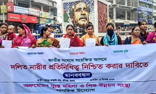 রায়হান হোসেন, চৌগাছা পৌর প্রতিনিধি : জাতীয় সংসদে সংরক্ষিত আসনে দলিত না’রীর প্রতিনিধিত্ব নিশ্চিত করার দাবিতে যশোরের চৌগাছায় মানববন্ধন অনুষ্ঠিত হয়েছে। সোমবার (৪ডিসেম্বর) শহরের মুক্তিযুদ্ধ ভাস্কর্য মোড়ে এ মানবন্ধন করে অশ্রুমোচন দুস্থ মহিলা ও শিশু উন্নয়ন সংস্থা। মানববন্ধনে অশ্রুমোচন দুস্থ মহিলা ও শিশু উন্নয়ন সংস্থার প্রোগাম অফিসার নাসির উদ্দিন, নির্বাহী পরিচালক শোভা রানী, কো- অর্ডিনেটর সুমিত্রা সরকার, একাউন্টস অফিসার অলক কুমার দাস প্রমুখ বক্তব্য রাখেন।