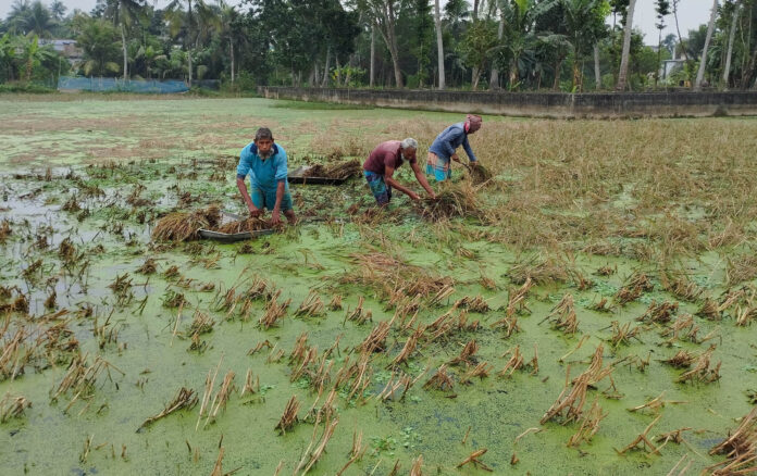 এহসানুল হোসেন তাইফুর, বিশেষ প্রতিনিধি : কেশবপুরে কৃষকের পাকা আমন ধান মাছের ঘেরের পানিতে তলিয়ে যাওয়ার অভিযোগ উঠেছে। পাকা ধান তলিয়ে যাওয়ায় বিপাকে রয়েছেন কৃষকরা। পানির মধ্য থেকে ধান কেটে উচু স্থানে উঠাতে কৃষকের গুনতে হচ্ছে বাড়তি টাকা। ২৭ বিল বাঁচাও আন্দোলন কমিটির পক্ষ থেকে দাবি করা হয়েছে এলাকার সকল মাছের ঘেরে একসঙ্গে সেচ শুরু হলে উপজেলার পাঁজিয়া ও সুফলাকাটি ইউনিয়নের নিচু এলাকার মানুষের বাড়িতে পানি উঠে আসার সম্ভাবনা রয়েছে।