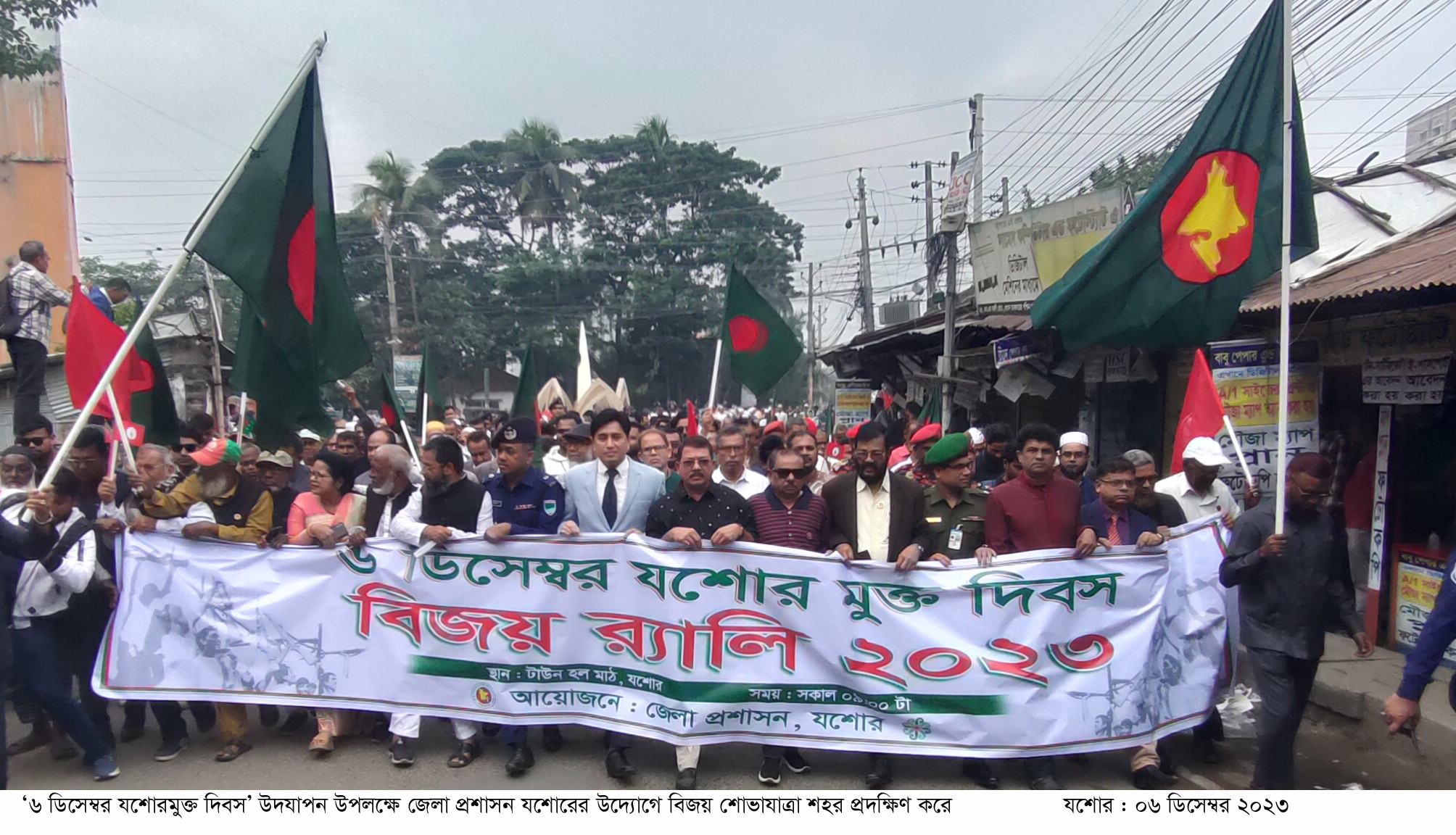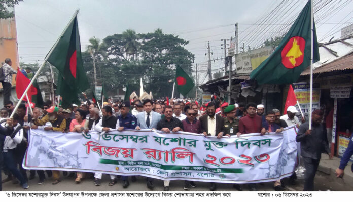 স্টাফ রিপোর্টার : বর্ণাঢ্য আয়োজনে উৎসবমুখর পরিবেশে মহান মুক্তিযুদ্ধের ঐতিহাসিক ‘৬ ডিসেম্বর যশোরমুক্ত দিবস’ উদযাপিত হয়েছে। মুক্তিযোদ্ধা-জনতার হাজারো প্রত্যয় দৃপ্ত কণ্ঠে জাতীয় সংগীত পরিবেশনা ও ‘জয় বাংলা, জয় বঙ্গবন্ধু’ শ্লোগানে মুখরিত বর্ণাঢ্য বিজয় আনন্দ শোভাযাত্রার মধ্য দিয়ে বুধবার এ দিবস উদযাপিত হয়। যশোর জেলা প্রশাসনের আয়োজনে একাত্তরের স্মৃতিবিজড়িত ঐতিহাসিক টাউন হল ময়দানে জাতীয় পতাকা শোভিত বর্ণাঢ্য শোভাযাত্রার উদ্বোধন করেন জেলা প্রশাসক মোহাম্মদ আবরাউল হাছান মজুমদার। বাদ্যের তালে তালে লাল-সবুজ রঙের বেলুন-ফেস্টুন উড়িয়ে এ শোভাযাত্রার উদ্বোধন করেন তিনি। আনন্দ শোভাযাত্রার আগে জাতীয় সংগীত পরিবেশন করেন শিল্পকলা অ্যাকাডেমির শিল্পীবৃন্দ। শুভেচ্ছা বক্তব্য দেন, জেলা প্রশাসক মোহম্মদ আবরাউল হাছান মজুমদার, জেলা পরিষদের চেয়ারম্যান সাইফুজ্জামান পিকুল, মুক্তিযুদ্ধচলাকালীন বৃহত্তর যশোরের মুজিব বাহিনীর কমান্ডার আলী হোসেন মনি, ডেপুটি কমান্ডার রবিউল আলম, যুদ্ধাহত বীর মুক্তিযোদ্ধা এএইচএম মুযহারুল ইসলাম মন্টু, যশোর সরকারি মাইকেল মধুসূদন কলেজের অধ্যক্ষ প্রফেসর মর্জিনা আক্তার, অতিরিক্ত পুলিশ সুপার বেলাল হোসাইন, সদর উপজেলা চেয়ারম্যান মোস্তফা ফরিদ আহম্মেদ চৌধুরী, শিল্পকলা অ্যাকাডেমির সাধারণ সম্পাদক অ্যাডভোকেট মাহমুদ হাসান বুলু, সম্মিলিত সাংস্কৃতিক জোট যশোর জেলা শাখার ভারপ্রাপ্ত সভাপতি দীপংকর দাস রতন। সঞ্চালনা করেন জেলা শিশু বিষয়ক কর্মকর্তা সাধন কুমার দাস, প্রধান শিক্ষক শ্রাবণী সুর ও সহকারী শিক্ষক আহসান হাবিব পারভেজ। শোভাযাত্রায় রণাঙ্গনের রণ হুংকার ‘জয় বাংলা’ স্লোগানে প্রকম্পিত করে তোলেন মুক্তিযোদ্ধা ও মুক্তিযুদ্ধের চেতনায় উজ্জীবিত তরুণ প্রজন্ম। আনন্দ শোভাযাত্রাটি শহরের গুরুত্বপূর্ণ সড়ক প্রদক্ষিণ করে বকুলতলায় বঙ্গবন্ধুর ম্যুরালে গিয়ে শেষ হয়। এখানে জাতির জনক বঙ্গবন্ধু শেখ মুজিবুরের প্রতিকৃতিতে মুক্তিযোদ্ধা- জনতা শ্রদ্ধাঞ্জলি প্রদান করেন। শোভাযাত্রায় যশোরের বীর মুক্তিযোদ্ধা, বিভিন্ন বয়সের সাধারণ জনগণ বিভিন্ন সরকারি-বেসরকারি কর্মকর্তা-কর্মচারী, সরকারি-বেসরকারি মাধ্যমিক ও উচ্চমাধ্যমিক শিক্ষা প্রতিষ্ঠানের শিক্ষক-শিক্ষার্থীসহ সামাজিক-সাংস্কৃতিক সংগঠনের উল্লেখযোগ্য কর্মীবৃন্দ অংশ নেন। শুভেচ্ছা বক্তব্যে জেলা প্রশাসক মোহম্মদ আবরাউল হাছান মজুমদার বলেন, যশোরের মাটি খাঁটি সোনা। এখান থেকেই বিজয়ের সূচনা হয়েছিল। মুক্তিযোদ্ধাদের সাথে নিয়ে আজ এ আনন্দ শোভাযাত্রাতে আমরা মুক্তিযোদ্ধাদের সাথে নিয়ে পথ চলছি। তিনি সকলকে এমনভাবে পথ চলায় আর্থ-সামাজিক ও মানবিক সমৃদ্ধ দেশ গঠনে সকলকে ভূমিকা রাখার 