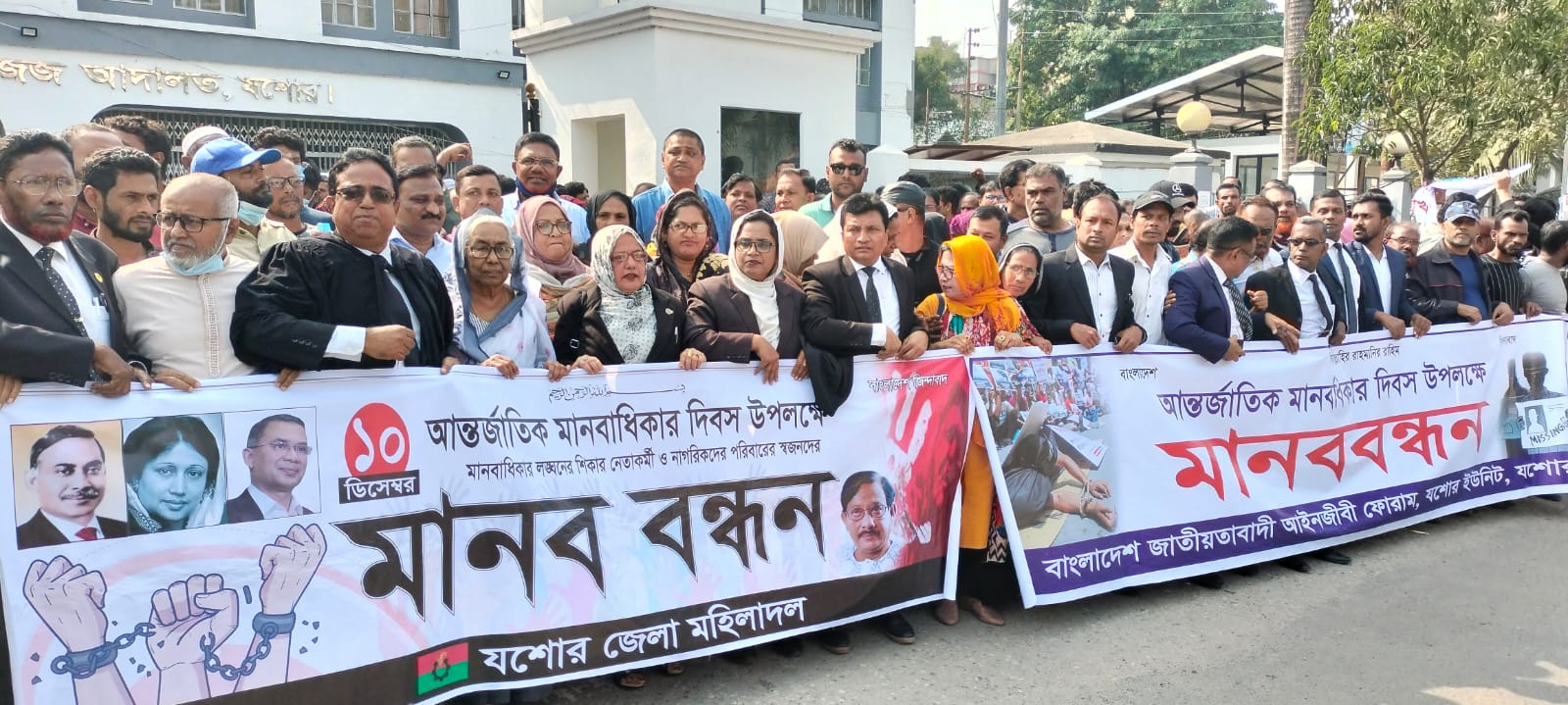 যশোর অফিস: আন্তর্জাতিক মানবাথিকার দিবসে যশোরে মানববন্ধন করেছে বিএনপি ও বিভিন্ন পেশাজীবী সংগঠন। বেলা সাড়ে ১১ টার দিকে জেলা দায়রা ও জজ আদালতের সামনে এ মানববন্ধন অনুষ্ঠিত হয়। প্রায় ঘন্টাব্যাপী এ মানববন্ধনে জেলা বিএনপির নেতাকর্মীরা ছাড়াও বর্তমান সরকারের আমলে খুন, গুম ও গ্রেফতার হওয়া নেতাকর্মীদের স্বজনরা অংশ নেন।মানববন্ধনে জেলা বিএনপির আহবায়ক অধ্যাপক নার্গিস বেগম, জাতীয়তাবাদী আইনজীবী ফোরামের যশোর জেলা শাখার নেতা অ্যাডভোকেট আব্দুল গফুর, অ্যাডভোকেট আমিনুর রহমানসহ অন্যান্য নেতৃবৃন্দ বক্তব্য রাখেন।