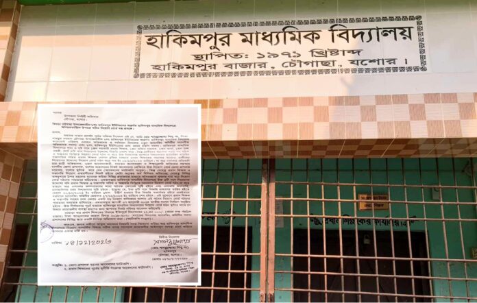 রায়হান হোসেন, চৌগাছা পৌর প্রতিনিধিঃ যশোরের চৌগাছার হাকিমপুর মাধ্যমিক বিদ্যালয়ে নিয়ম বহির্ভূতভাবে নিয়োগ বোর্ড গঠনের অভিযোগ পাওয়া গেছে। অনিয়মতান্ত্রিক উপায়ে গঠিত এই নিয়োগ বোর্ড স্থগিতের দাবিতে উপজেলা নির্বাহী কর্মকর্তা বরাবর লিখিত অভিযোগ দাখিল করেছেন ওই বিদ্যালয় ব্যবস্থাপনা কমিটির অভিভাবক সদস্য ও স্থানীয় ইউপি সদস্য শামসুজ্জোহা শিপু।