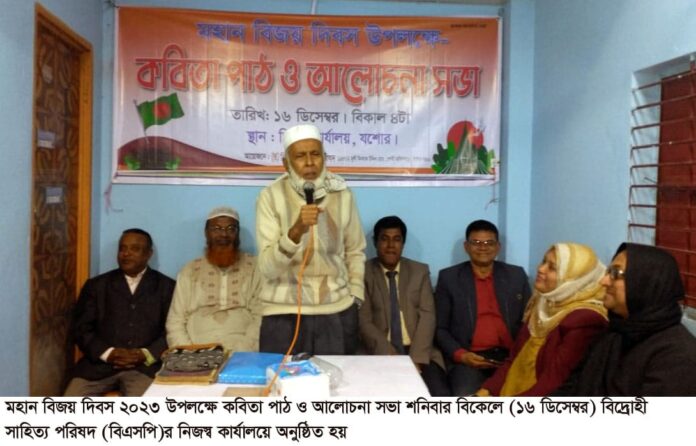 যশোর প্রতিনিধি: বিদ্রোহী সাহিত্য পরিষদ (বিএসপি) উদ্যোগে মহান বিজয় দিবস ২০২৩ উপলক্ষে কবিতা পাঠ ও আলোচনা সভা শনিবার বিকেলে (১৬ ডিসেম্বর) শহরের পোস্ট অফিস পাড়ার নিজস্ব কার্যালয়ে অনুষ্ঠিত হয়। অনুষ্ঠানে প্রধান অতিথি হিসেবে বক্তব্য রাখেন বিশিষ্ট শিক্ষাবিদ. প্রফেসর ড. মো. মুস্তাফিজুর রহমান। সম্মানিত অতিথি হিসেবে একাত্তরের রণাঙ্গনের কাহিনী তুলে ধরে স্মৃতিচারণ করেন, বীর মুক্তিযোদ্ধা আমিরুল ইসলাম রন্টু, বীর মুক্তিযোদ্ধা ডা. আহাদ আলী। আলোচক হিসেবে উপস্থিত ছিলেন বিশিষ্ট শিক্ষাবিদ, প্রফেসর ড. সবুজ শামীম আহসান, কবি ও গবেষক পারভীনা খাতুন, কবি মনিরুজ্জামান, কবি নাঈম নাজমুল, কবি শাহরিয়ার সোহেল।সংগঠনের সহসভাপতি কবি আমির হোসেন মিলনের সভাপতিত্বে বিএসপির সাধারণ সম্পাদক গোলাম মোস্তফা মুন্নার পরিচালনায় কবিতা পাঠ করেন, নূরজাহান আরা নীতি, অধ্যাপক সুরাইয়া শরীফ, রাশিদা আখতার লিলি, আহমেদ মাহাবুব ফারুক, সহকারী অধ্যাপক মঞ্জুয়ারা বেগম, শরিফুল আলম, ডা. অমল কান্তি সরকার, এসএম তোজাম্মেল হক, অরুণ বর্মন, কাজী নূর, সঞ্জয় নন্দী, ভদ্রাবতী বিশ^াস, এম এ কাসেম অমিয়, কুতুব উদ্দিন বিশ^াস, ডা. জি,জি এ কাদরী, শেখ  হামিদুল হক, শংকর নিভানন,  রশিদ শিমুল, হুমায়ন কবীর, রেজাউল করিম রোমেল, মনোজ চক্রবর্তী, সানজিদা ফেরদৌস, মাহবুবুল হক রবি, এমএম মনিরুল ইসলাম, নজরুল ইসলাম, শ্রী হাজারী লাল সরকার, ইরফান খান, আমিনুর ইসলাম, টুম্মা প্রমুখ।মহান বিজয় দিবস উপলক্ষে শনিবার সকালে যশোর পুরাতন বাসটার্মিনাল এলাকায় বিজয় স্তম্ভে শ্রদ্ধাঞ্জলি অর্পণ করা হয়।