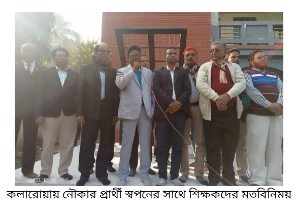 এম, এ সাজেদ,কলারোয়া ( সাতক্ষীরা) প্রতিনিধি: সাতক্ষীরা-১,( তালা-কলারোয়া) আসনে নৌকার প্রার্থী ফিরোজ আহম্মেদ স্বপন শিক্ষকদের সাথে সৌজন্য সাক্ষাৎ ও মতবিনিময় করেছেন। বুধবার(২০ ডিসেম্বর) সকাল ৯ টায় কলারোয়া গার্লস পাইলট মাধ্যমিক বিদ্যালয়ের শহীদমিনার চত্বরে মাধ্যমিক পর্যায়ের শিক্ষকমন্ডলীর সাথে ও মতবিনিময় হয়। মতবিনিময় সভায় নৌকার প্রার্থী ফিরোজ আহম্মেদ স্বপন বলেন, আমি শিক্ষক পরিবারের সদস্য হিসেবে আপনাদের মাঝে এসেছি। আমি আপনাদের কারও ভাই, কারও বন্ধু। আপনাদের সাথে মিলেমিশে আজীবন থাকতে চাই। এলাকার শিক্ষা বিস্তারে তিনি অতীতের মতো সকল সময় কাজ করে যাওয়ার প্রত্যয় ব্যক্ত করেন। এসময় তিনি প্রধানমন্ত্রী জননেত্রী শেখ হাসিনার মনোনীত প্রার্থী হিসেবে সকলের দোয়া ও আন্তরিক সমর্থন কামনা করেন। মতবিনিময় সভায় অন্যান্যের মধ্যে উপস্থিত ছিলেন জেলা শিক্ষক সমিতির সভাপতি প্রধান শিক্ষক আমানুল্যাহ আমান, প্রধান শিক্ষক হরি সাধন ঘোষ, প্রধান শিক্ষক আজহারুল ইসলাম, প্রধান শিক্ষক বদরুজ্জামান বিপ্লব, প্রধান শিক্ষক নুরুল ইসলাম, প্রধান শিক্ষক রুহুল আমিন, প্রধান শিক্ষক এবাদুল হক, প্রধান শিক্ষক শফিকুল ইসলাম, প্রধান শিক্ষক আজিজুর রহমান, শিক্ষক ও সাংবাদিক দীপক শেঠ, মোস্তফা বাকী বিল্লাহ শাহী, হাফিজুর রহমান, হুমায়ুন কবির মিঠু, শামসুর রহমান লাল্টু, জাহাঙ্গীর হোসেন, আসাদুজ্জামান আসাদ, বনি আমিন, উৎপল কুমার সাহা, ইব্রাহীম হোসেন, আব্দুল করিম, আব্দুস সবুর, বদরুজ্জামান বদরু, জাকাতুল্যাহ, রহুহুল কুদ্দুস, মহসীন আলি, শাহরিয়ার কবির সুমনসহ মাদ্রাসা ও হাইস্কুল পর্যায়ের ৮ শতাধিক শিক্ষকবৃন্দ।
