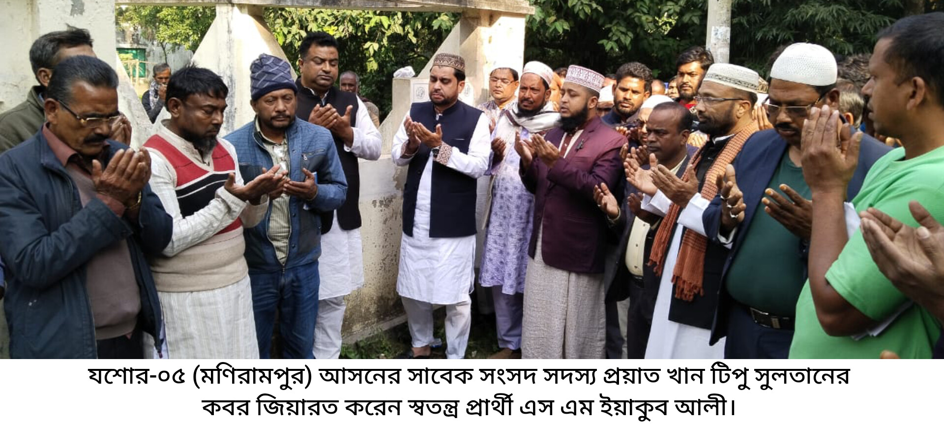 যশোর-০৫ (মণিরামপুর) আসনের সাবেক সংসদ সদস্য প্রয়াত খান টিপু সুলতানের কবর জিয়ারত করেছেন স্বতন্ত্র প্রার্থী এস এম ইয়াকুব আলী। মঙ্গলবার দুপুরে দলীয় নেতাকর্মীদের সাথে নিয়ে খুলনার ডুমুরিয়া উপজেলার ধামালিয়া গ্রামে গিয়ে প্রয়াতের কবর জিয়ারত করেন তিনি।অপরদিকে, একইদিনে বিকেলে মণিরামপুর উপজেলার কপালিয়া বাজার ও কামালপুরে ঈগল প্রতীকের প্রচারণা করেন স্বতন্ত্র প্রার্থী এম ইয়াকুব আলী। এসময় তিনি বলেন, সাধারণ মানুষের সেবক হতে আপনাদের কাছে দোয়া নিতে এসেছি। মণিরামপুরে সাধারণ মানুষ নির্যাতিত নিপীড়িত আমি তাদের ভাগ্যউন্নয়নের কাজ করতে চাই। তাই এই নির্বাচনে আমি এমপি প্রার্থী হয়েছি। আমার ঈগল প্রতীকে ভোট দিয়ে বিজয়ী হয়ে আপনাদের সেবা করার সুযোগ চাই।এসময় উপস্থিত ছিলেন উপজেলা পরিষদের সাবেক ভাইস চেয়ারম্যান মিকাইল হোসেন, আওয়ামী লীগ নেতা বাবুল আক্তার বাবলু,বিল্লাল হোসেন মিন্টু, আবুল বাশার,উপজেলা কৃষকলীগের সভাপতি আবুল ইসলাম, স্বেচ্ছাসেবক লীগের আহবায়ক অরবিন্দু হাজরা, চালুয়াহাটি ইউনিয়ন আওয়ামী লীগের যুগ্ম আহবায়ক শহিদুল ইসলাম মিলন, মহিলা আওয়ামী লীগের সাবেক সভাপতি আমেনা বেগম প্রমুখ।