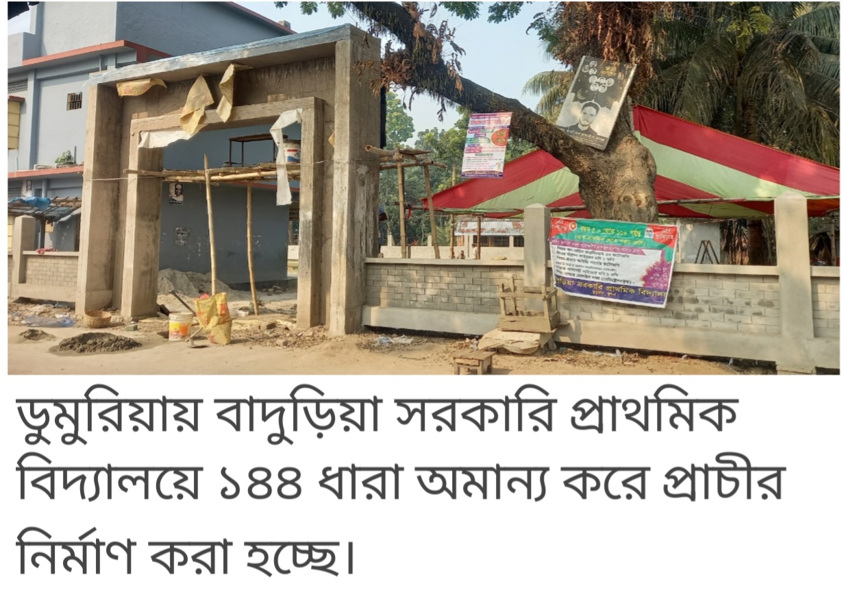 ভ্রাম্যমান প্রতিনিধি , ডুমুরিয়া (খুলনা) : ১৪৪ ধারা অমান্য করে খুলনার ডুমুরিয়ায় বাদুড়িয়া সরকারি প্রাথমিক বিদ্যালয়ের সীমানা প্রাচীর নির্মাণ করার অভিযোগ পাওয়া গেছে। এসংবাদে ডুমুরিয়া থানা পুলিশের উপ পরিদর্শক (এসআই) মোঃ কাজল হোসেন আদালতের নির্দেশে শান্তি শৃঙ্খলা রক্ষার্থে কাজ বন্ধ করে দিয়েছেন। এদিকে বিদ্যালয়ের প্রধান শিক্ষক মিতালী মন্ডলের বিরুদ্ধে নির্ধানিত সময়ে স্কুলের না আসার অভিযোগ পাওয়া গেছে।